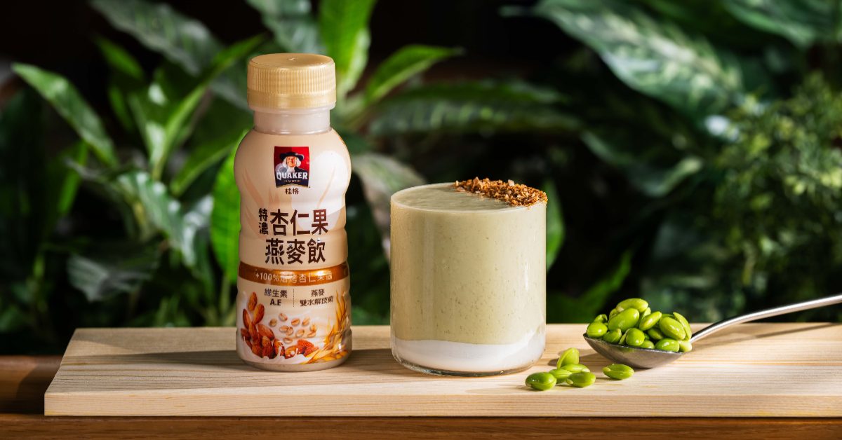 創新運用「桂格特濃杏仁果燕麥飲」為基底,加入毛豆與堅果,融合植物蛋白與好油脂,一杯即滿足代謝所需營養。連不愛吃毛豆的人,也會被其香氣與滑順口感收服。