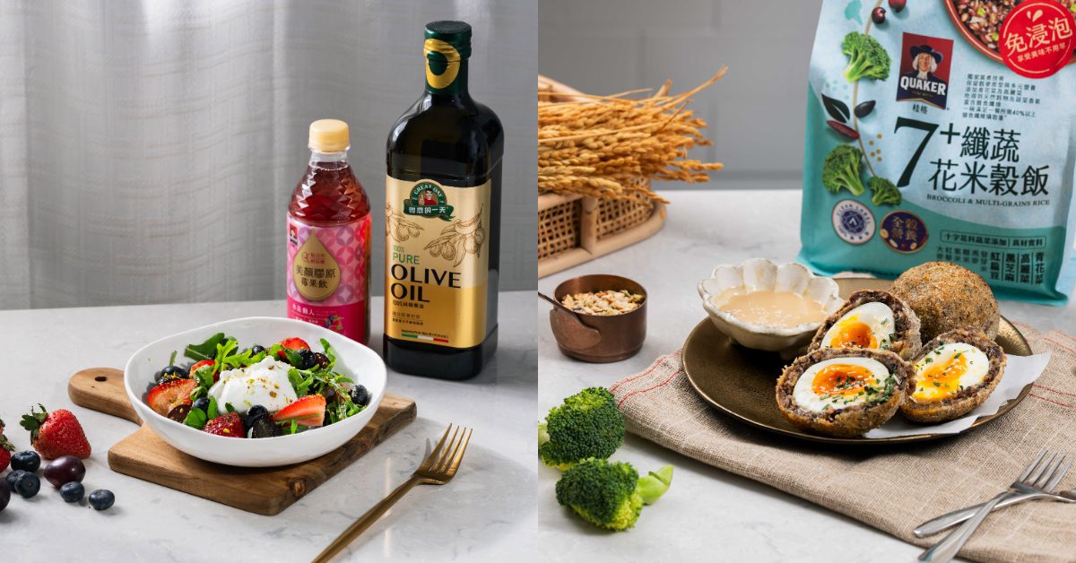 ■ 「高纖」食譜 纖蔬花米蘇格蘭蛋&燕麥飲味噌胡麻醬:將煮熟的「桂格免浸泡7+纖蔬花米穀飯」包裹蛋白質豐富的醣心蛋,並使用「得意的一天日本玄米油」塗刷放入烤箱,出爐後以加入「桂格特濃杏仁果燕麥飲」調製的胡麻醬做提味,創意十足又具高飽足感的好醣、好油、高纖新選擇。