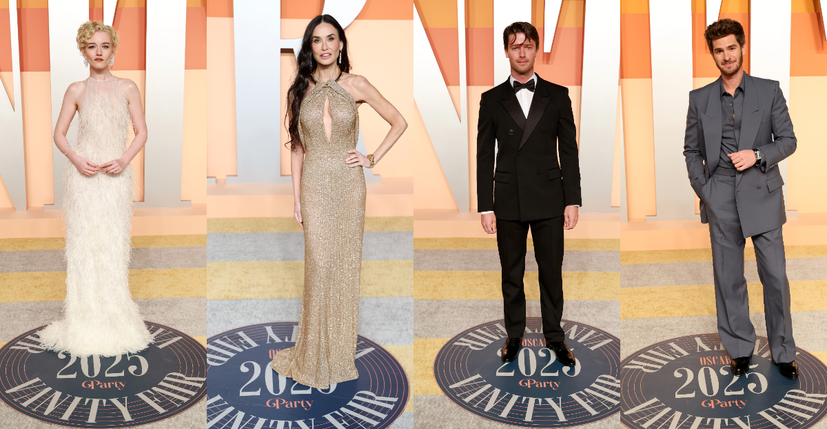 2025 年Vanity Fair奧斯卡慶功派對在鎂光燈的閃爍下展開,如一場精心編排的華麗夢境。九位名人身著Gucci禮服踏上紅毯,每一步都彷彿帶著時光的餘韻——或如流金歲月裡的影后,或似老好萊塢電影中走出的名伶。柔軟的絲質面料輕輕貼合肌膚、寶石與裝飾珠飾在燈光下躍動,Gucci 於此不僅是一場時尚的演繹,更是一種關於風華與記憶的投影,星光熠熠映照出紅毯上的華麗。