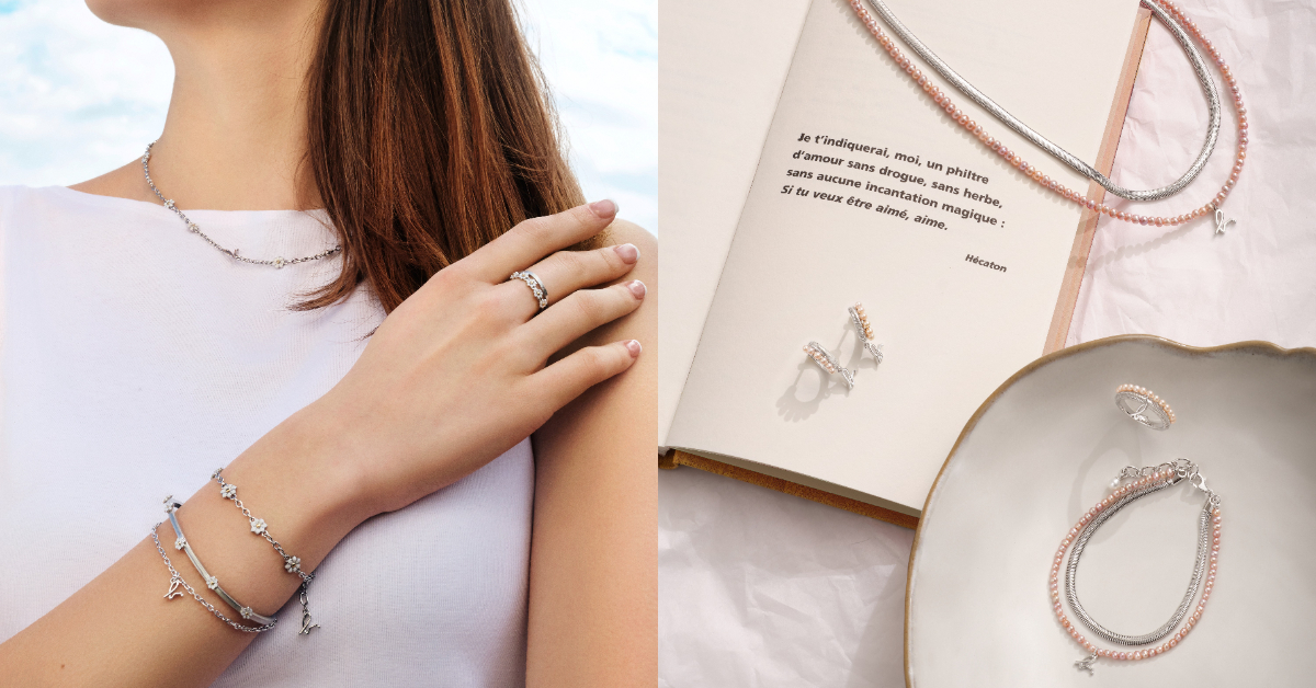 型態立體的白色小雛菊,花瓣與花蕊分別鑲嵌入白色、金黃色琺瑯,帶來自然清新氣息。戒指與手鍊採用獨特的雙環設計,不須層疊佩戴即可於腕間顯現迷人風采。
