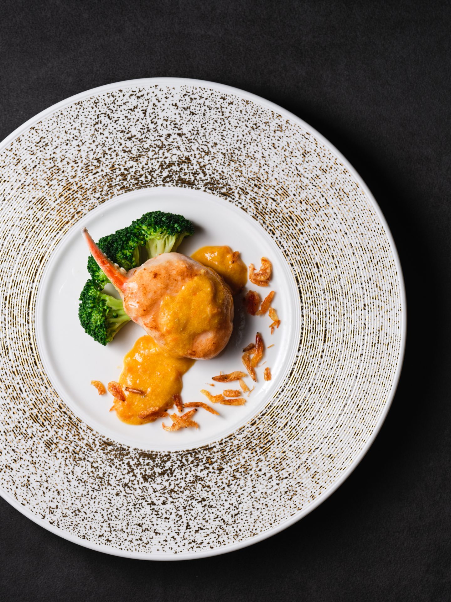 「蟹粉小湯包」以手工擀製的麵皮,輕薄柔韌,卻能撐起滿滿蟹黃蟹膏的鮮味,餡料融合濃郁蟹粉與鮮甜豬肉,一口咬開湯汁迸發,蟹香撲鼻,唇齒之間盡是溫潤與鮮美。 若說蟹粉是粵菜中的不可或缺的主角,「順德生焗紅蟳」則是本季最具創意的轉化,靈感源自順德魚腸焗蛋,主廚轉化為秋蟹版本,精選十兩重紅蟳,搭配土雞蛋、豬肉末與酥脆油條,高溫烘烤,蟹香與蛋香融合,滑嫩與酥香交織,每一口皆是秋蟹精華。「薑蔥炒大沙公」則展現粵菜鑊氣魅力,嚴選十八兩大沙公,先以乾蔥蒜末爆香,再整隻高溫酥炸至金黃,淋上花雕酒與上湯提鮮。蟹殼焦香,蟹肉緊實入味,鮮香在鍋氣中盡情釋放,讓人吮指回味。