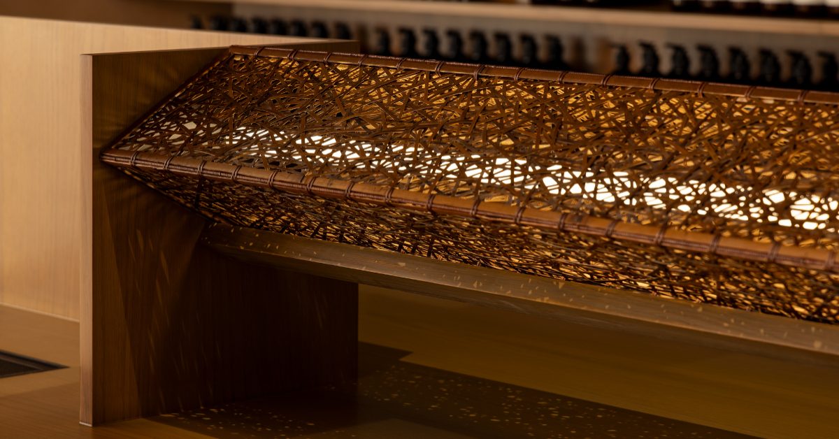其設計語彙帶有受粗獷主義(Brutalist)色彩,但又與之有所偏離:少了粗獷主義代表性的冷硬的混凝土與玻璃,而是以具溫度手感的自然有機材質呈現。整體空間保留大自然雕刻型態的最初概念,塑造出錯落有致的秩序感,注重空間的實用性與結構型態,呈現出巨大、不特別經過修飾的角形結構,以其大地色調作為包覆此空間的外殼,賦予其內斂而均勻的視覺感受。而內部——牆面與家具——則全以木材打造,其質地溫潤、堅固耐用,觸感溫暖,為空間注入自然的暖意。店舖透過不規則的傾斜切割線條,打破人們的常規視角,讓人對比例與尺度產生新的感知,也進一步強化了此空間旨在歌頌錯綜交融的自然與人造、原始與精緻之間細膩的相互對話。