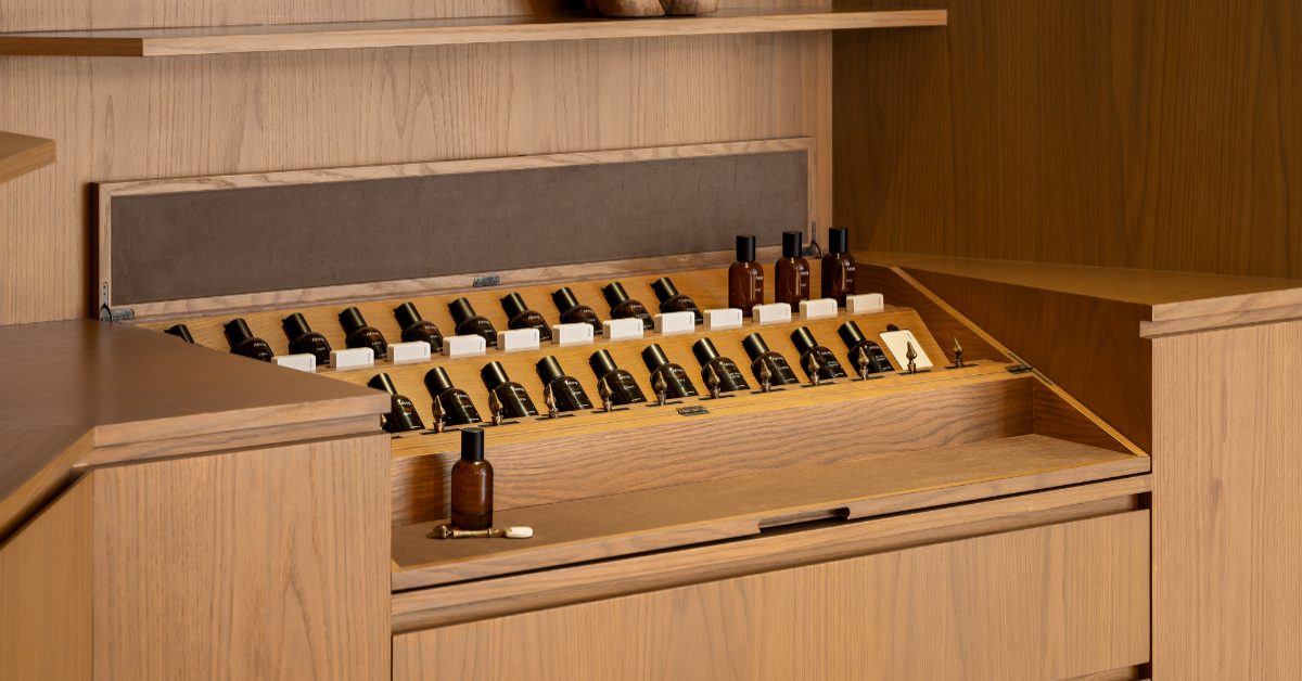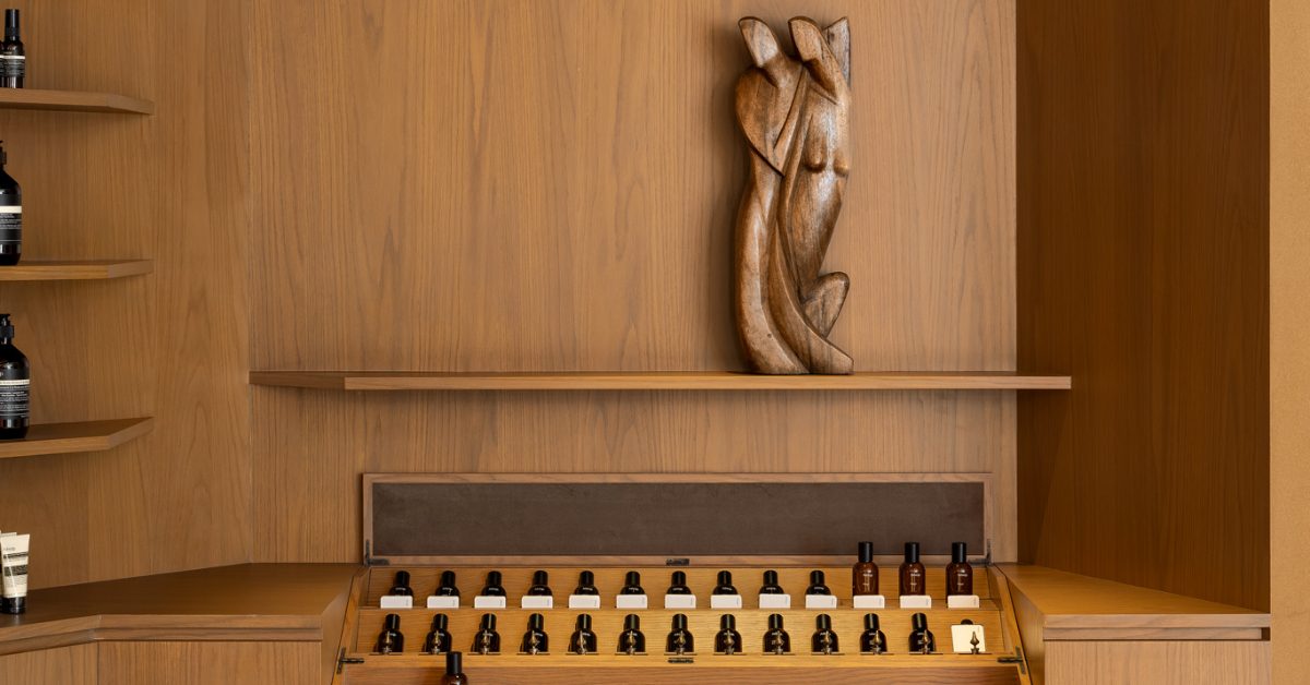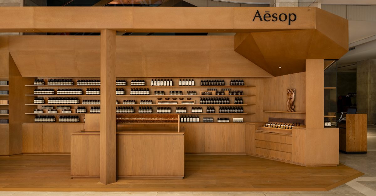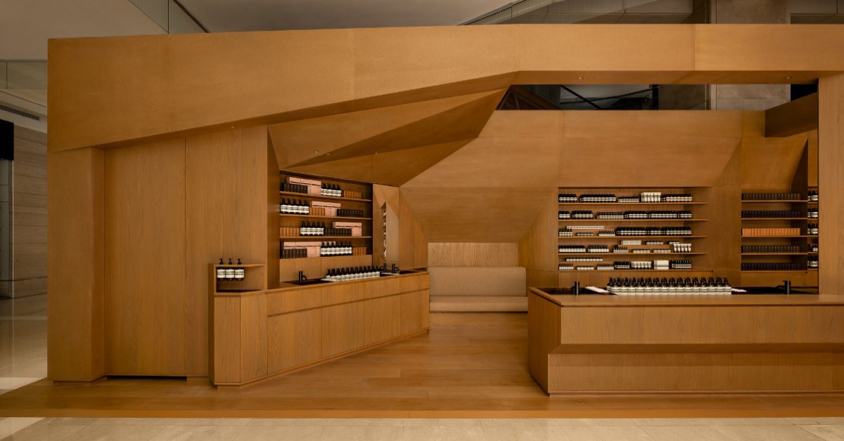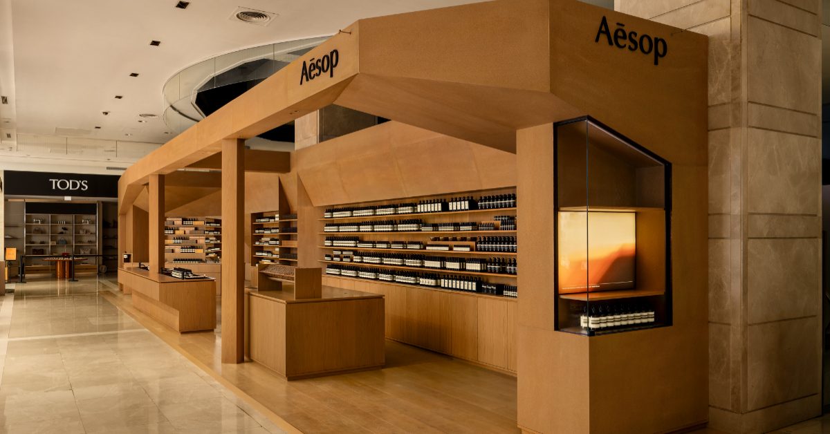 Aesop 以平靜而溫暖、自在舒適的空間——帶來美好的視覺、觸覺、嗅覺享受來款待顧客,踏入店內,百貨喧鬧聲漸漸遠去,一種更深層的對比隨之展開。