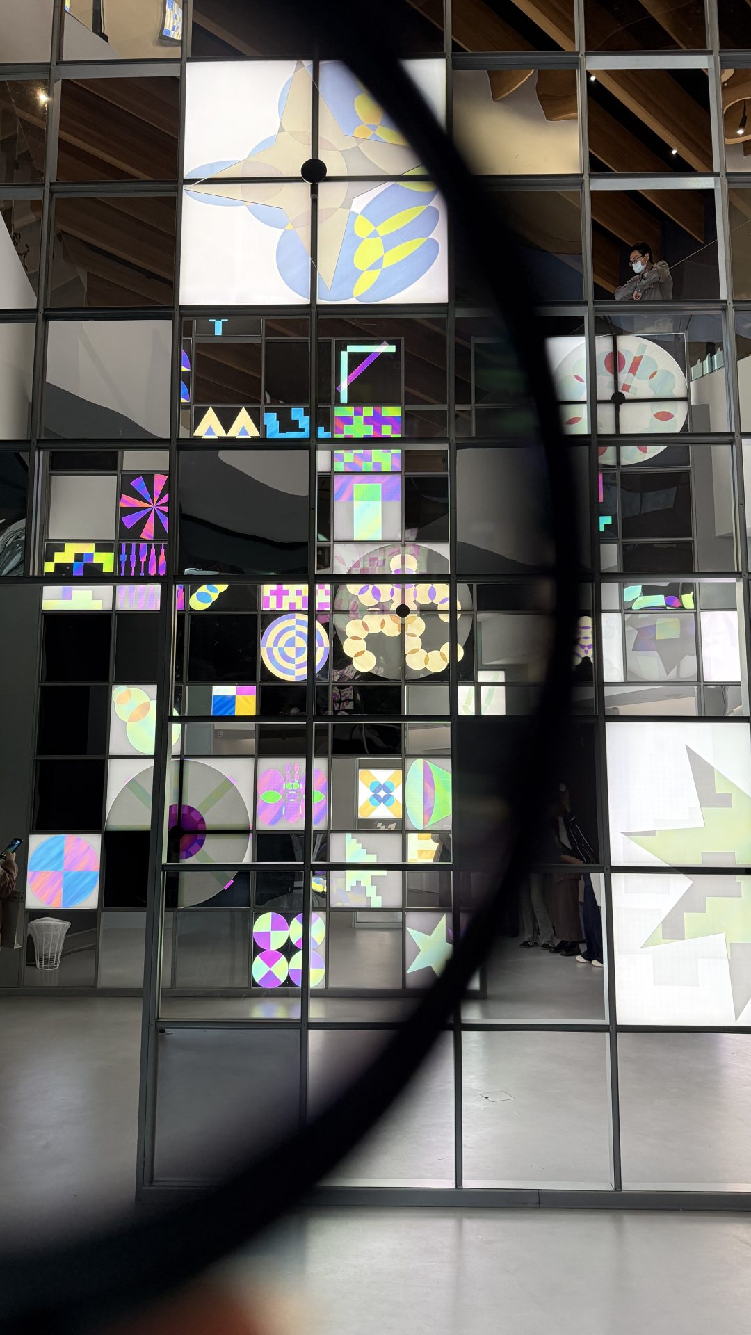 展間最特別的,是那面七公尺高的像素矩陣,設計成出入口的格局讓觀眾自由探索,數個或大或小、或圓或方的白色燈箱與鏡面,透過購買門票附贈的偏光鏡轉動,以及身體的移動位置,潛藏在其中的色層與線條也隨之浮現。此時,觀眾就像是觸發機關的開關,透過有意識的行動,讓開啟與空間的共振對話。