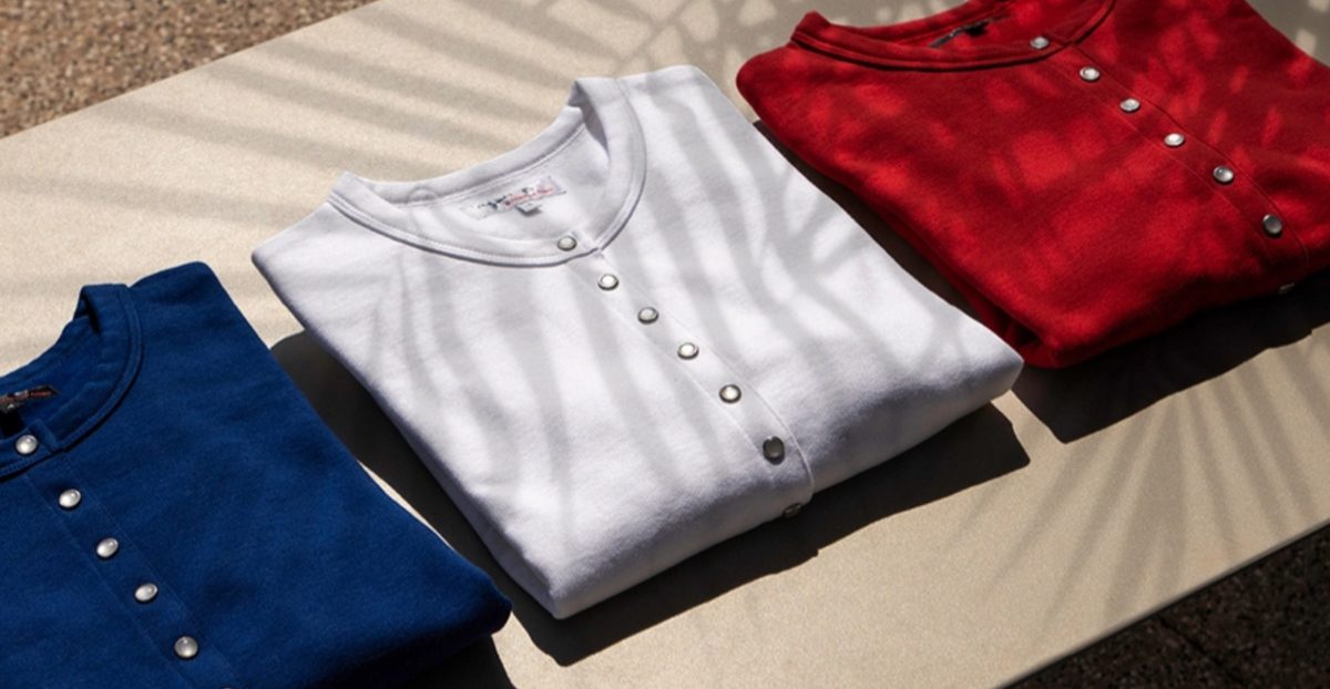 1979年,一個灼熱的夏天,Agnès女士靈機一動,把一件普通的圓領棉衫從正中剪開,再一顆顆縫上精緻的釘釦,造就了品牌歷史上第一件 Snap Cardigan。這不僅是設計的革新,更是一位女性對「穿著自由」的一場溫柔革命。