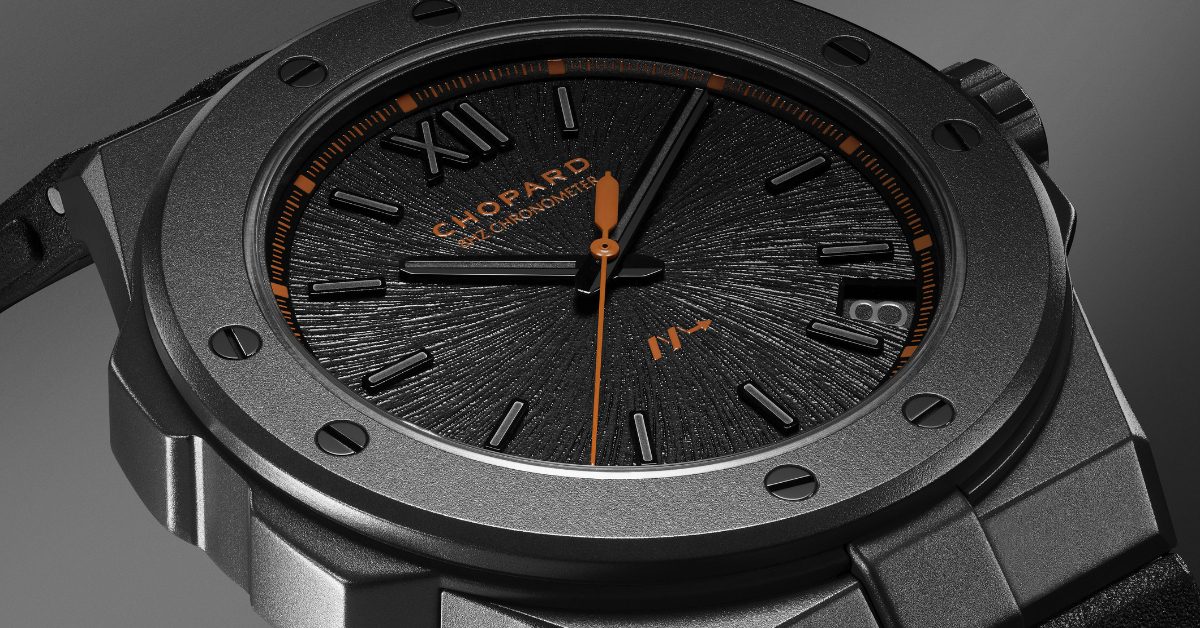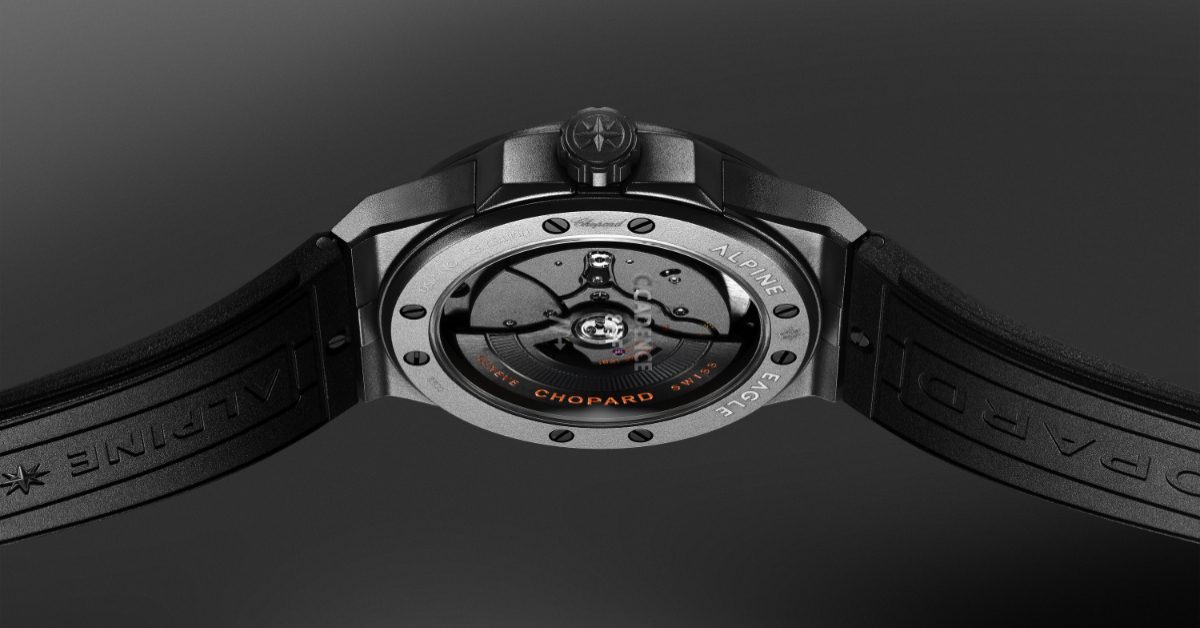 為極致減輕重量,每個細節皆精心考量。首先,直徑41毫米、厚9.75毫米的錶殼,以及飾有八顆等距螺絲的錶圈、鐫刻羅盤玫瑰圖案的錶冠,以至錶帶的錶扣,均以5級陶瓷鈦金屬鑄造。除了輕巧的優點外,陶瓷鈦金屬的應用亦彰顯蕭邦工坊的先鋒精神:這種超強韌金屬是以電漿技術將鈦金屬氧化而成,此處理技術令其硬度高達1000維氏度,抗衝擊及抗刮性能媲美陶瓷。這種常用於航空業及汽車工業的物料,更呈現出歷久彌新的炭灰色調 ─ 對於一枚專為應付極端環境而設計的腕錶而言,此為一大優勢。