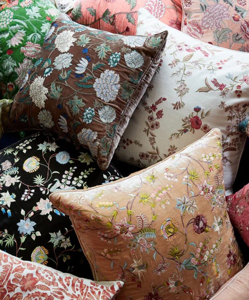 Anke Drechsel 以天鵝絨、絲綢與其他天然布料為基礎,搭配細膩立體刺繡,打造兼具視覺層次與手感溫度的家飾作品。此次引進的核心品項為 絨毛布偶與刺繡抱枕,兩者皆展現品牌對材質、刺繡節奏與色彩運用的精準掌握。所有作品均由工藝師以純手工縫製,每一針的密度、方向與壓線皆細緻可見,使成品在近距離觀看時層次分明、耐看而靜謐。