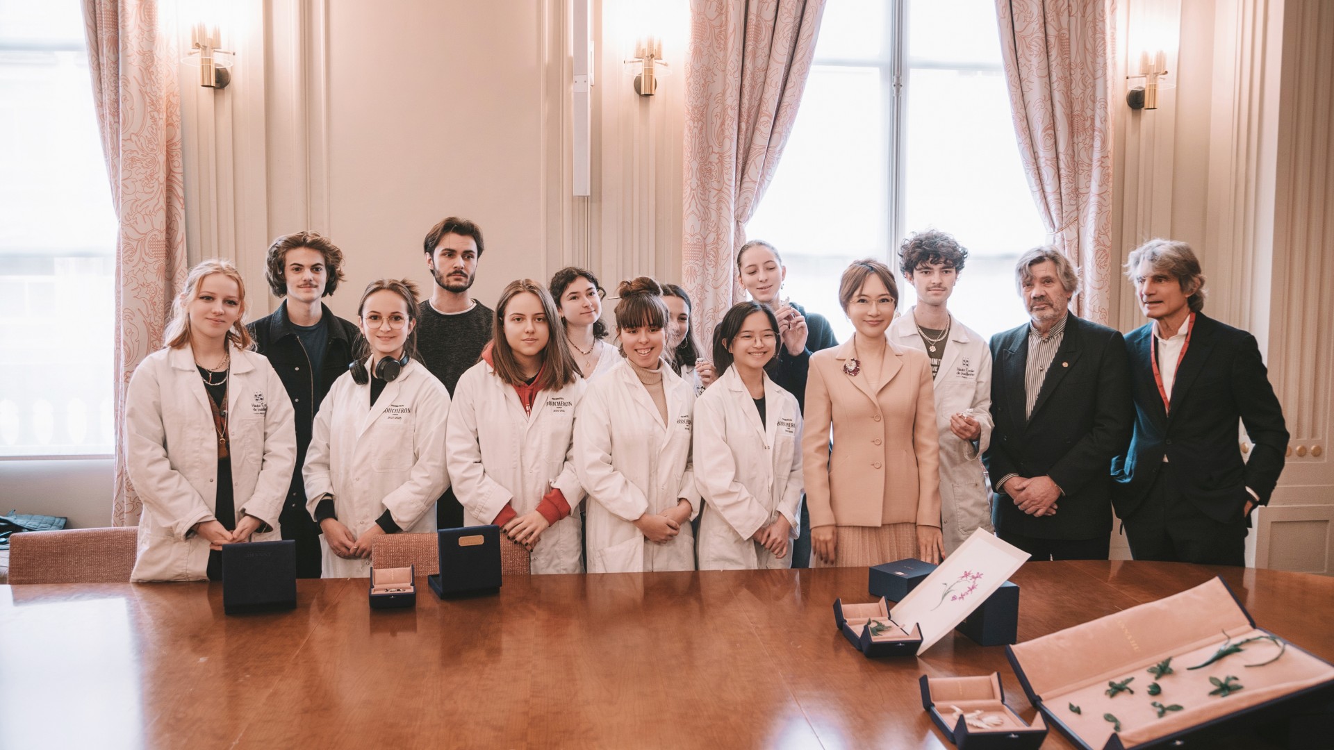 2024年6月3日,Anna 攜手吉美博物館館長雅尼克. 林茨(Yannick Lintz)女士、法國巴黎高等珠寶學院院長 Bernadette Pinet-Cuoq 女士、法國巴黎高等珠寶學院總監 Michel Baldocchi 先生及學院珠寶設計學士指導教授 Isabelle Lelong 女士共同出席盛會,甄選並揭曉參與本計畫13位學生作品中,最佳設計金銀銅獎獲獎名單,並將由 Anna Hu 支援投入精選獲獎作品手繪稿打造為成品,作為學生參與本計畫之殊榮獎勵。