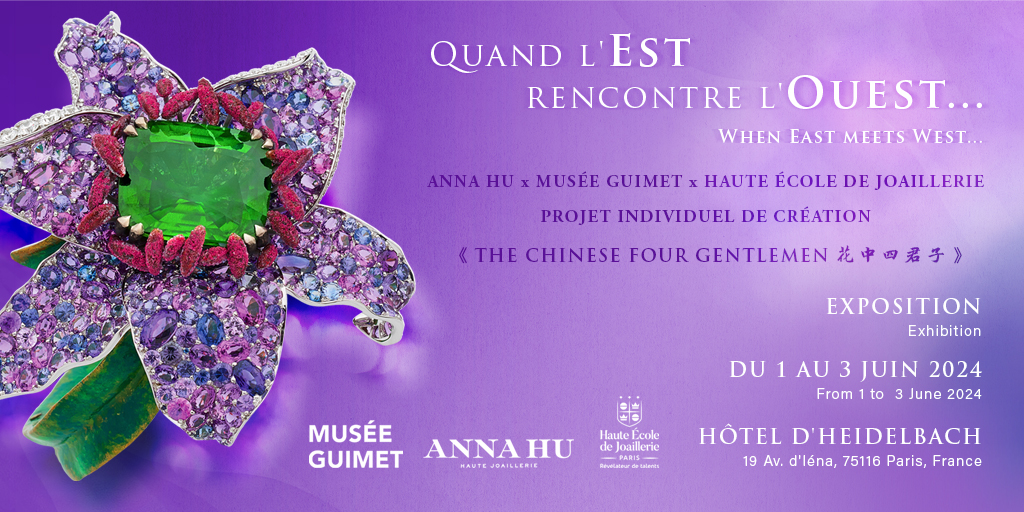 2024年,ANNA HU 高訂珠寶品牌創辦人暨珠寶藝術家 Anna Hu 胡茵菲女士,受全世界最古老珠寶學院——法國巴黎高等珠寶學院(Haute École De Joaillerie,HEJ)之邀,擔任其年度《創意人才驅動計畫》(Projet Individuels de Création,PIC)官方特聘首席指導大師。Anna 攜手法國吉美國立亞洲藝術博物館(Musée Guimet,簡稱吉美博物館),以中華文化中極具代表性的藝術題材「花中四君子」為主題,帶領 13 位 HEJ 珠寶設計專業學士三年級學生,汲取吉美博物館藏品為靈感; 自2024年春季,Anna 定期與13位學生設計師會面傳授,以珠寶藝術專業詮釋中華古老文化精髓,承襲東西文化交流之使命,為珠寶藝術開啟璀璨新時代。