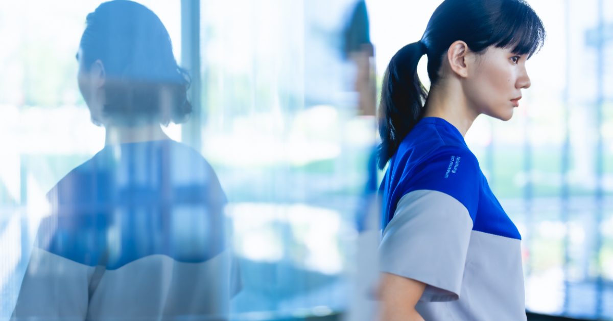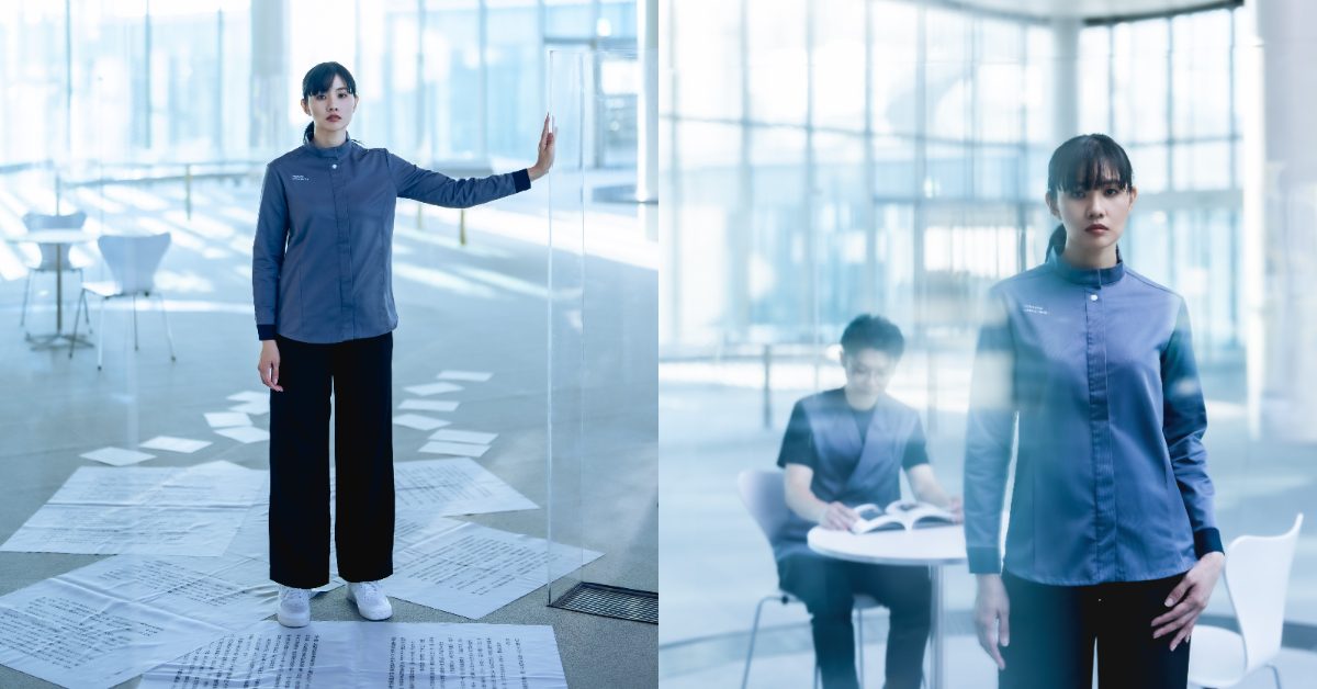 其中,美術館工作服上半身以藍色不規則墨流色塊點綴,象徵藝術創作的自由流動;圖書館制服則以深灰為主調,於口袋與袖口加入深藍跳色,展現沉穩簡潔且具辨識度的風格。