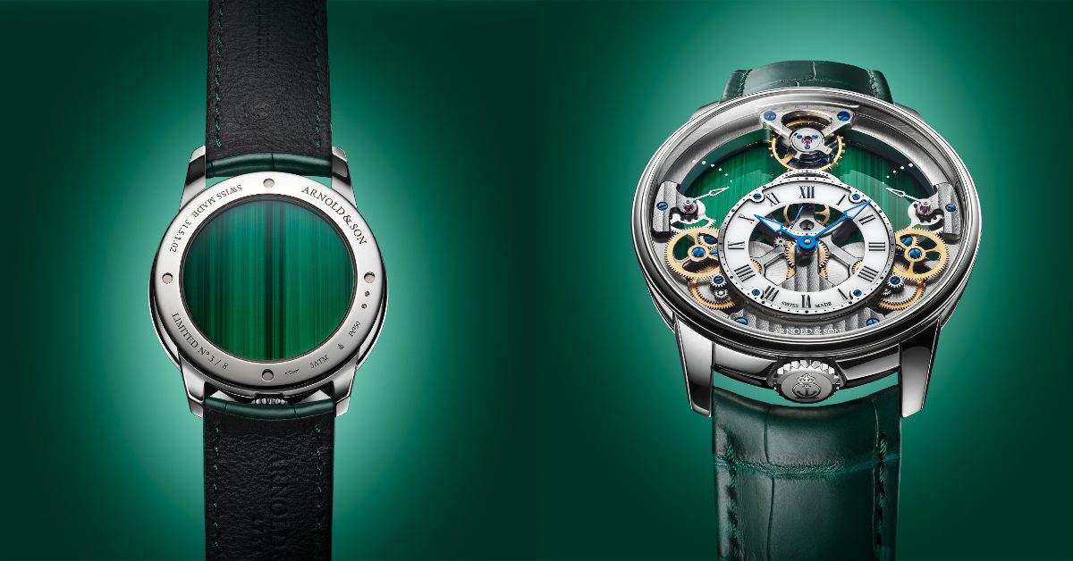 Arnold & Son 為致敬其源自英國的製錶傳承與獨樹一幟的製錶語彙,將品牌經典之作 Time Pyramid 以全新手法再度演繹。新作中,標誌性的金字塔式機芯彷彿懸浮於錶殼之內,分別以鉑金款與 5N 紅金款各限量八枚呈現。化身為錶盤的孔雀石,展現層次豐富而深邃的綠色光澤,如同舞台背景般襯托整體結構,使作品散發罕見而內斂的優雅氣息。