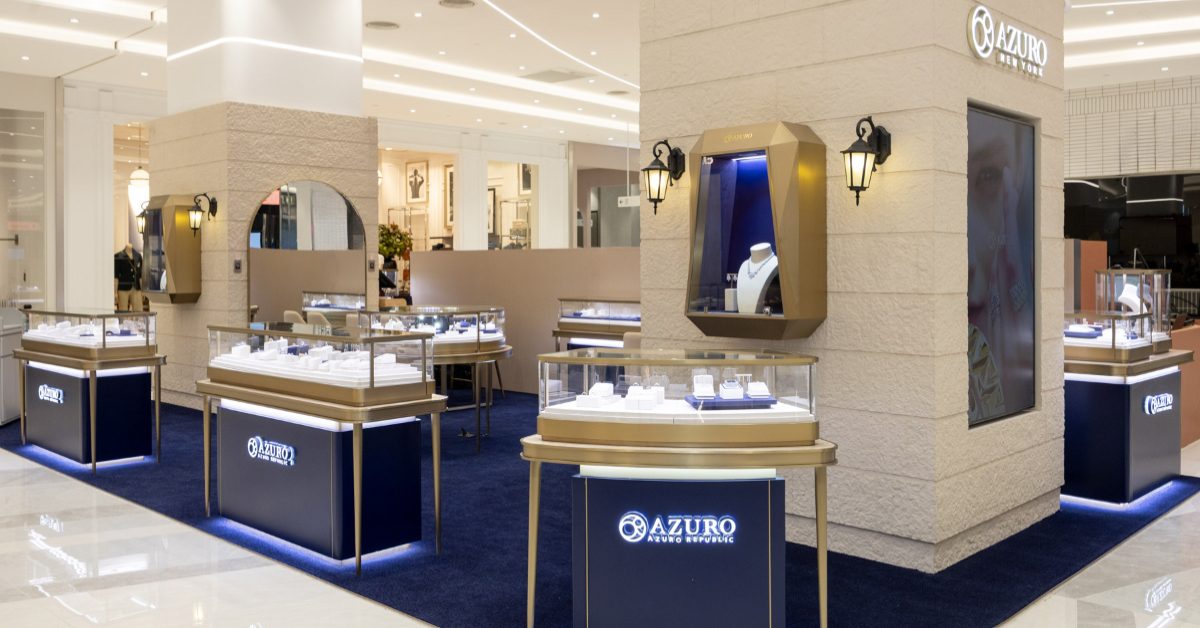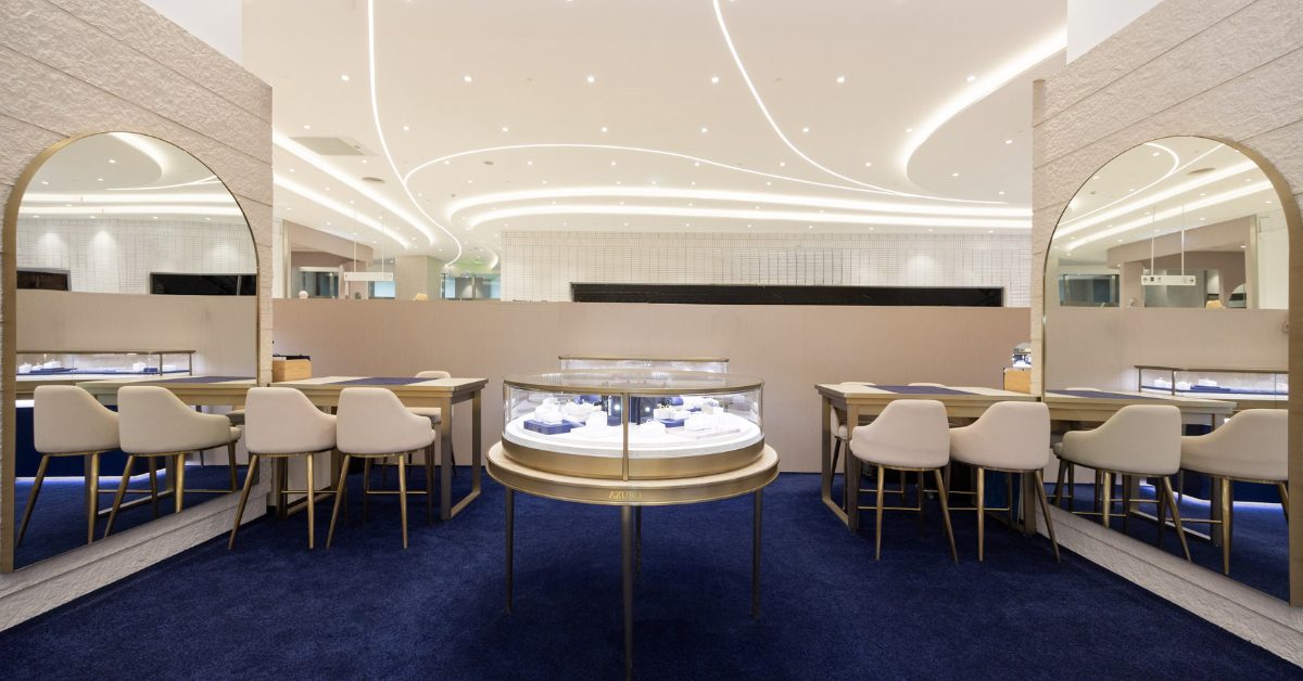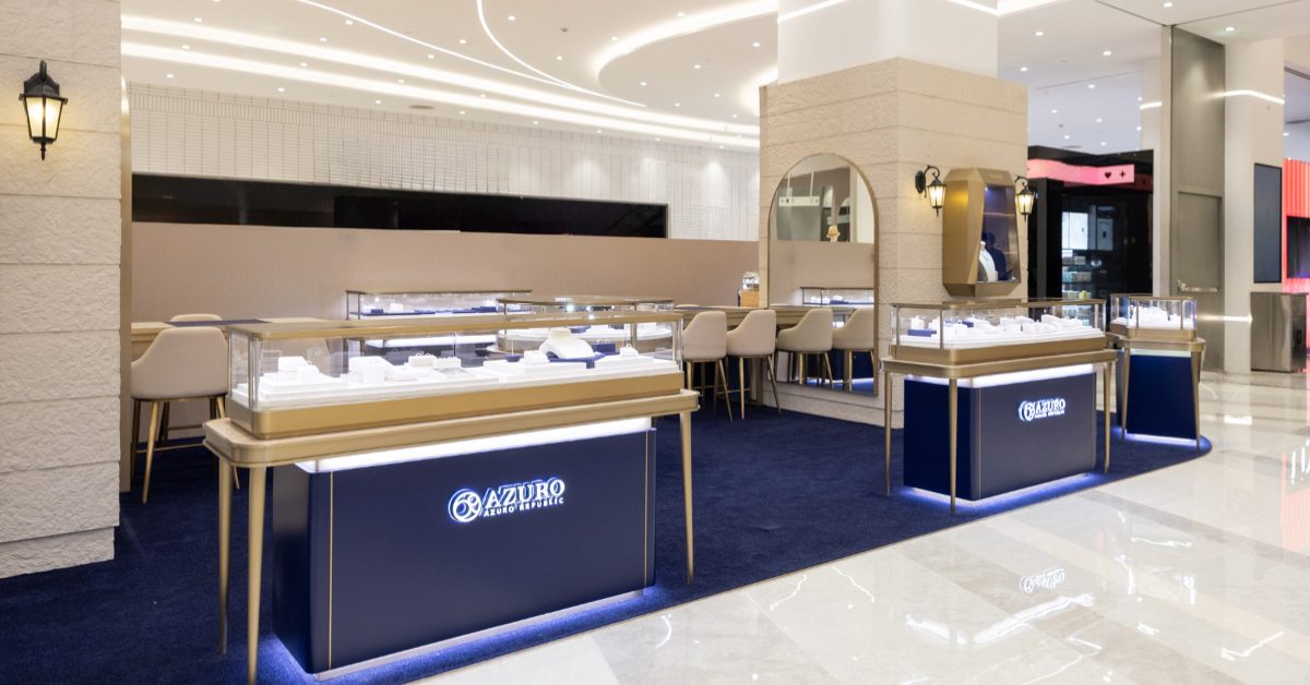 此次 Azuro Republic 進駐台北 DREAM PLAZA 國際精品區,其全新形象專櫃延續品牌設計語彙,以「大地石材 × 月桂藍金屬」為空間主題,打造如珠寶本身般光彩流轉、層次分明的體驗場域。專櫃主色調選擇品牌象徵榮耀與智慧的代表色「皇家月桂藍」,搭配柔金金屬線條及天然米白大理石石材,展現沉靜、優雅卻不失現代張力的氛圍。展示櫃體設計更運用鍍鈦金屬包邊與大理石紋理互為呼應,在自然與工藝、內斂與光芒之間取得的絕佳平衡。