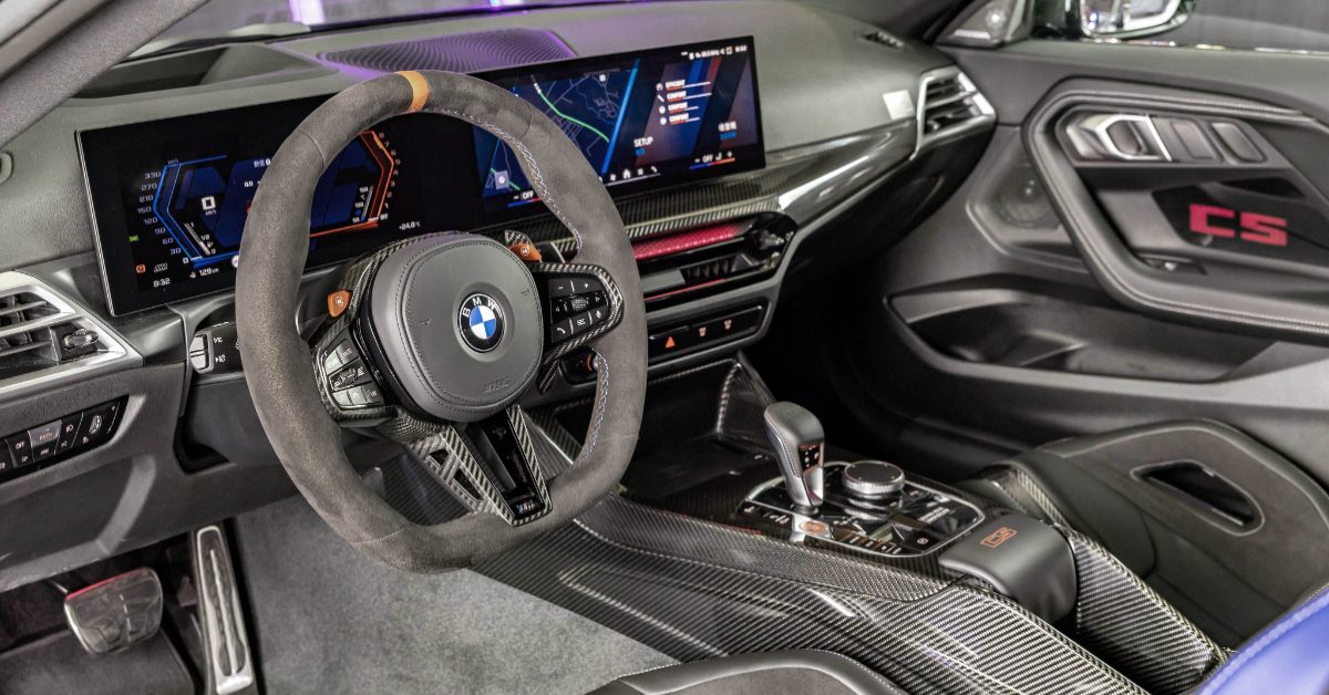 坐進車內,你會立刻理解 BMW 為什麼稱它為 CS。Alcantara 麂皮平底方向盤、12 點鐘紅色中心標記、滿佈碳纖維的飾板與中央鞍座,營造出濃厚的戰鬥氛圍,但這並不意味著日常被犧牲。M 碳纖維賽車桶型座椅在提供強大包覆性的同時,仍保留電動調整與加熱機能;BMW Operating System 8.5 與 M 專屬介面,讓駕駛資訊一目了然。甚至,這也是首款導入主動車距定速控制的 CS 車型,提醒你:它可以是賽道利器,也能是日常生活的一部分。
