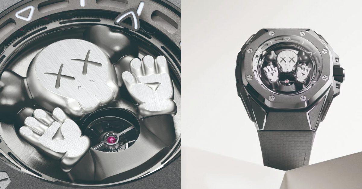 除了色彩外,好心情也可來自充滿趣味的主題。愛彼攜手潮流藝術家 KAWS 打造皇家橡樹陀飛輪概念腕錶「Companion」, 光是看到八角錶殼內的 Companion 公仔,誰都會忍不住面露微笑吧!Companion 公仔完全以鈦金屬製作,透過交替霧面打磨及微珠噴砂潤飾呈現出深淺不一的灰色對比色調,豐富層次與質感。為了將面盤空間讓給公仔,愛彼特別採用外緣時間顯示設計,兩個交疊齒輪由小齒輪和滾輪牽引,驅動時針和分針圍繞面盤外緣旋轉。表殼採多面切割設計,每個切面都各自搭配微珠噴砂、霧面或拋光打磨,與 Companion 公仔的對比質感和灰色色調相呼應。一個字都不必說,把錶亮出來就足以讓人看出 KAWS 灰暗卻詼諧的藝術風格。