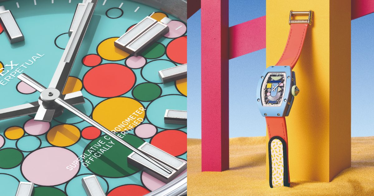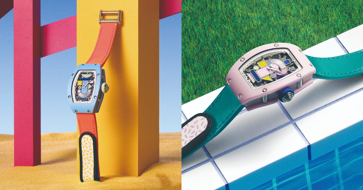 在複雜技術上不斷創新,很多人忘記了 Richard Mille 最初也是以風格大膽闖出一片天,而 RM07-01 彩色陶瓷腕錶正是 Richard Mille 色彩美學的全新見證。汲取 1980 年代義大利興起的「Memphis Design」建築藝術風格,大量混搭不同素材,兼顧色彩與材質的多樣化。RM07-01 先在面盤上鏤空雕刻出 「Memphis Design」風格的結構,接著以不規則形式裝上彩色陶瓷、雷射切割橡膠嵌花和鑽石鑲嵌等幾何形狀的裝飾。厲害的是,這些裝飾物上還經過手工機刻雕花,縱橫交錯的線條為光滑表面帶來細膩的紋路,使光影變化更加明顯。從配色、造型到材質選擇流露趣味,卻又結合傳統工藝,在輕鬆寫意中展現細膩匠心。