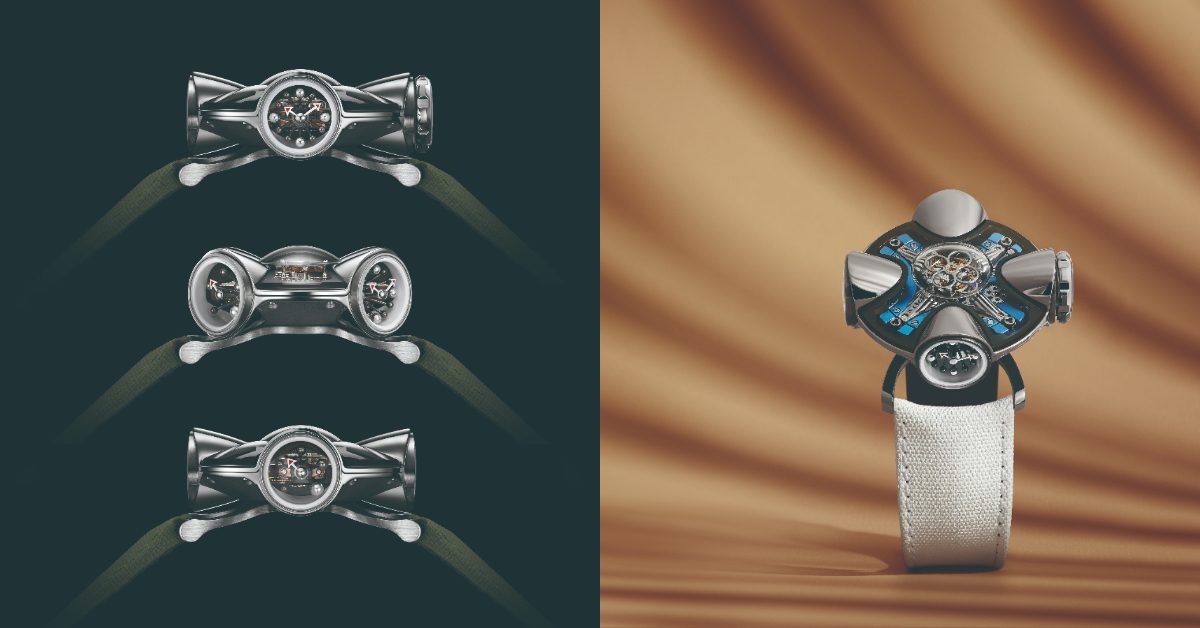 熟悉 MB & F 的錶迷都知道,它的 Horological Machine 系列總在各種意象中馳騁,打造意想不到的獨特造型。其中 HM11 Architect 靈感源自 1960 年代的建築風格,此時期的建築多有著泡泡、波浪的拱型輪廓。HM11 Architect 以陀飛輪為中心向外延伸出四個對稱的「房間」,分別標示時間、動力儲存、溫度及調整時間上鍊的錶冠。頂部則有雙弧形藍寶石水晶鏡面遮蓋在機芯的四葉形夾板上,就像是教堂的天窗。為了實現這個造型,機芯也必須特製,MB & F 甚至在機芯和下層錶殼間配置四個高張力懸吊彈簧來加強避震,光機芯就由多達 364 枚零件組成。看似複雜前衛,錶殼實際上卻只有 42 毫米,又是超輕盈的鈦金屬材質,炫技之餘還兼顧舒適配戴。