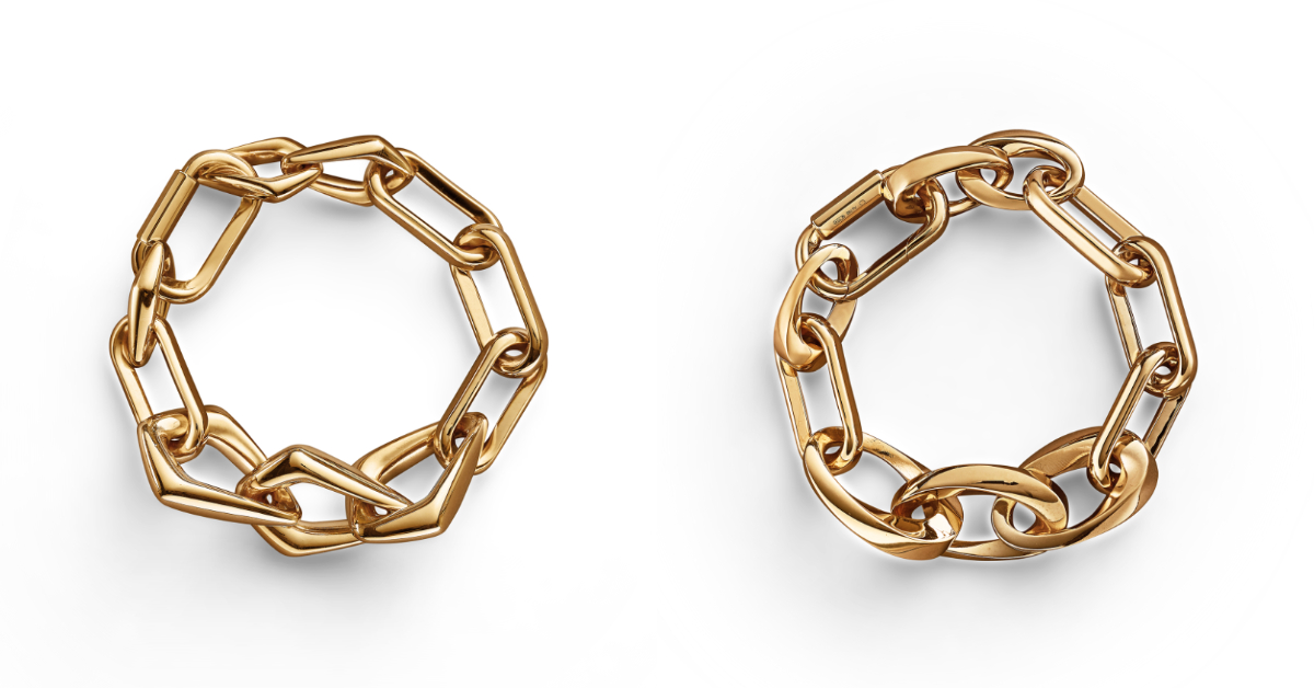 Catena 系列的美學靈感汲取自古老的威尼斯吊燈,同時借用了 Fin 和 Twisted 珠寶系列的形狀尺寸。該系列採用精湛的鑄造工藝打造,產品包括兩條可拼接成項鍊的手鍊。