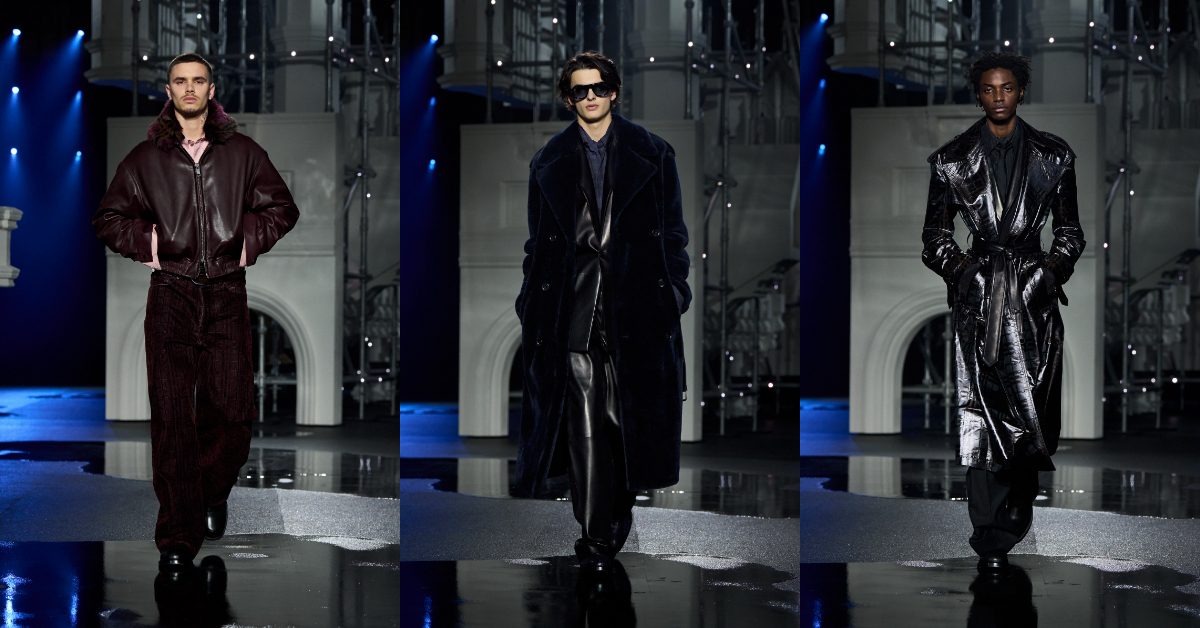 經典元素經過錯置與解構,成為男裝設計靈感:以更年輕的方式演繹大衣穿搭、燕尾服與絲質襯衫。機能性單品搭配皮革飛行員外套、連帽衫與雨衣,被賦予了晚裝的意境。整體效果明確直接,飽和穩定的色彩營造出更精緻講究、簡潔流暢的質感。Daniel Lee表示:「既適合夜晚,也適合白天。」