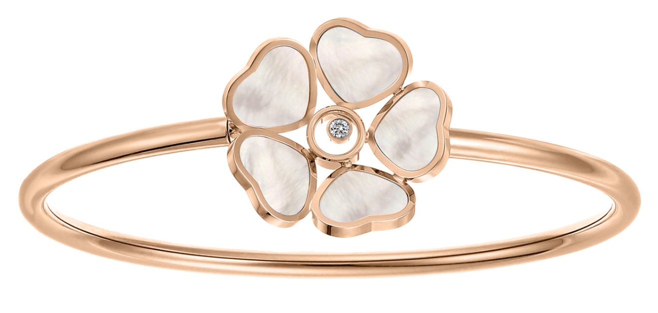 Happy Hearts 系列珠寶,以輕盈設計傳遞花季的浪漫尾聲。採用符合倫理道德標準的 18K 玫瑰金,五顆心形如花瓣環繞中央滑動的鑽石,綻放出精緻柔美的花朵意象,彰顯品牌經典「Little Diamonds Do Great Things」精神。珍珠母貝展現溫潤光澤,玫瑰金與白金交錯設計突顯層次感,兼具經典與百搭特質。