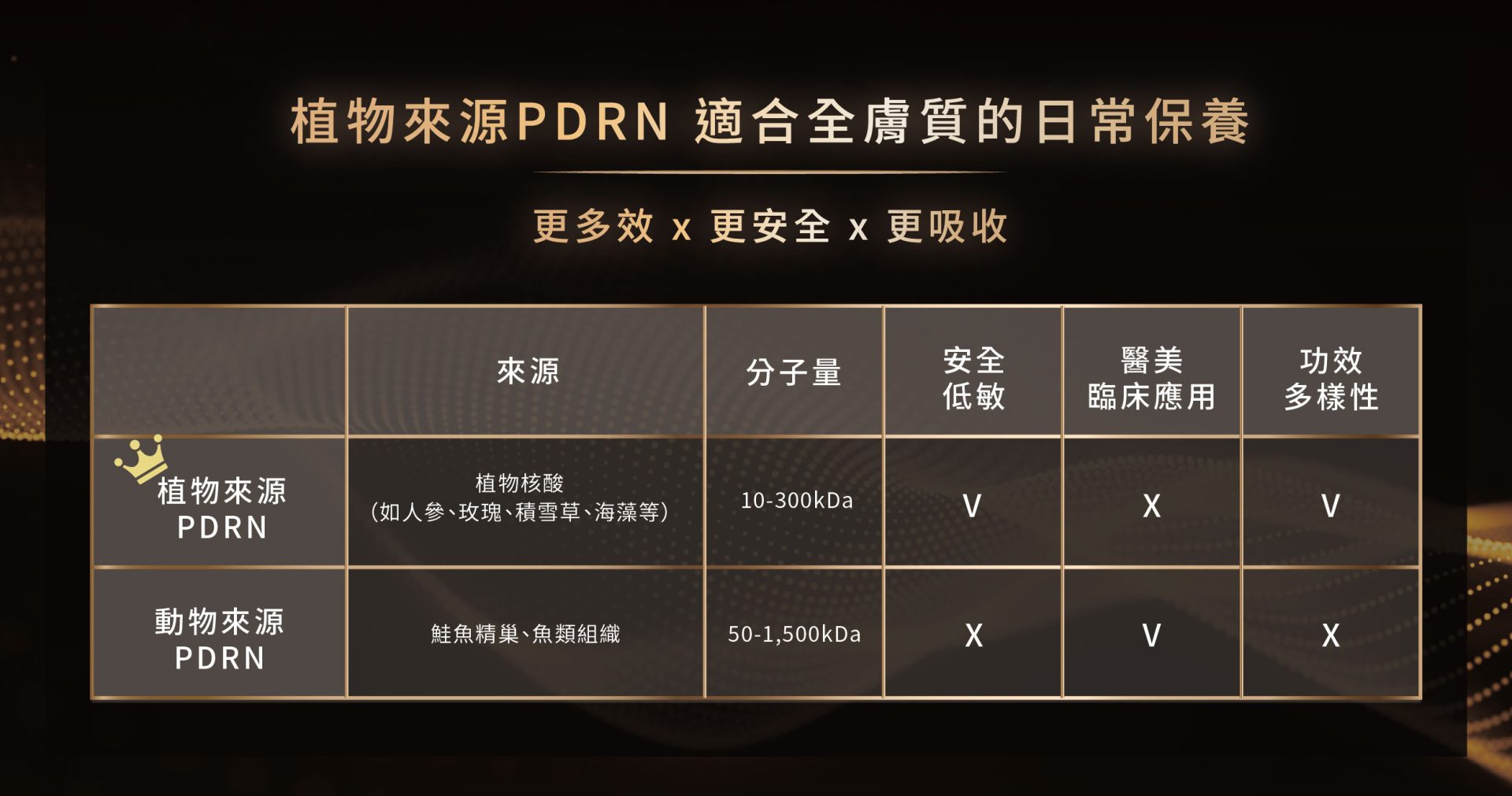 雖然傳統動物來源PDRN(如鮭魚)在醫美注射中被廣泛使用,但可能帶來過敏或免疫排斥風險,使用上受膚質限制,較不適合長期居家保養。相比之下,植物來源的玫瑰PDRN分子量更小,滲透速度快、吸收效率高,不僅安全低敏,廣泛適用各種膚質,連敏弱肌也能安心使用,更適合長期納入保養流程。更特別的是,植物PDRN在保留修護與再生核心效能的同時,還帶來天然植物附加效益。以玫瑰PDRN為例,不僅有效支援肌膚修護與再生,還具抗氧化力,加乘抗老效果,讓肌膚從內而外保持健康、明亮、彈嫩。