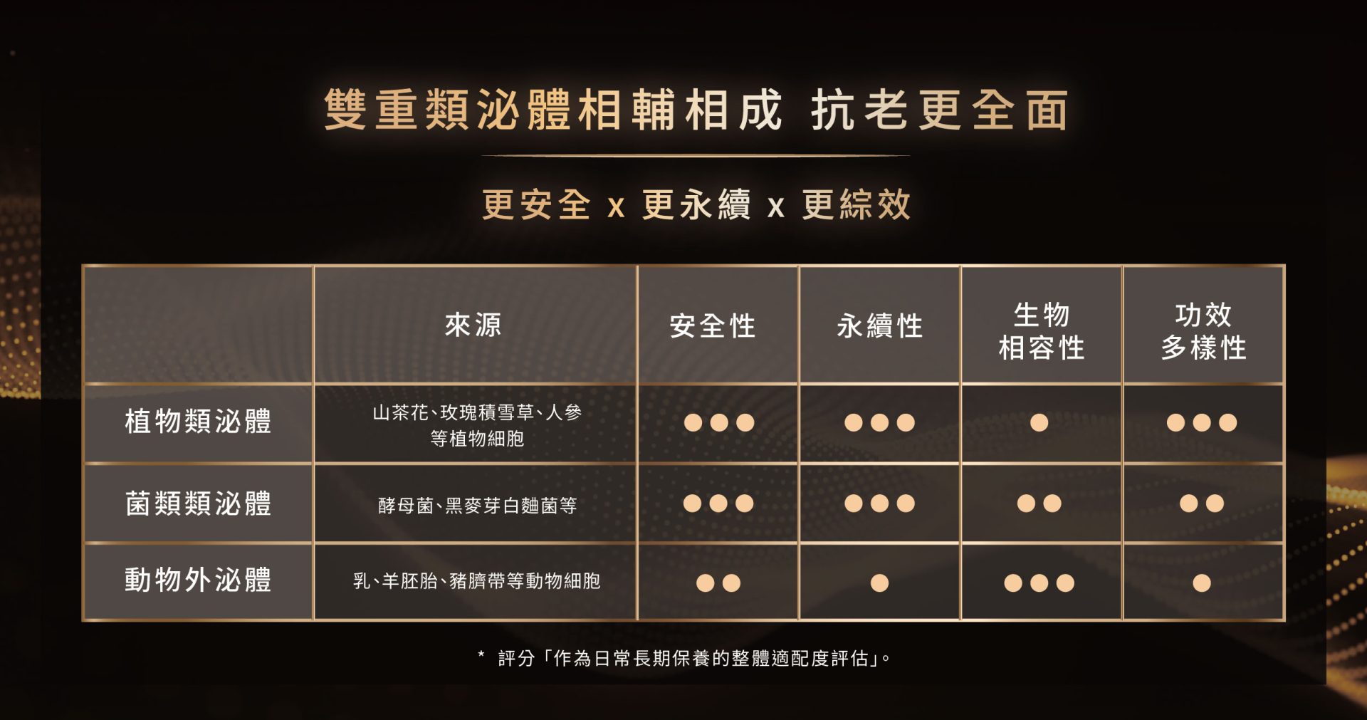 酵母菌類泌體是肌膚穩定修護的核心力量,修復受損細胞、加速再生,同時注入保濕、舒緩與屏障防禦力,幫助肌膚抵禦光老化,重現健康光澤與彈力;山茶花類泌體則強化肌膚對抗老化的能力,促進細胞更新、改善細紋與皺紋,並抑制黑色素生成、減少氧化損傷,提亮膚色、防禦光老化。兩者相輔相成,讓肌膚抗老更全面、修護更穩定,呈現年輕、明亮的健康狀態。