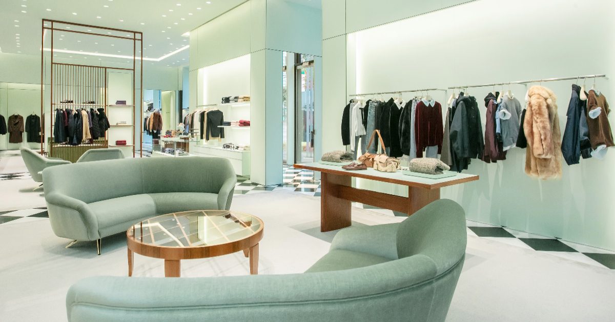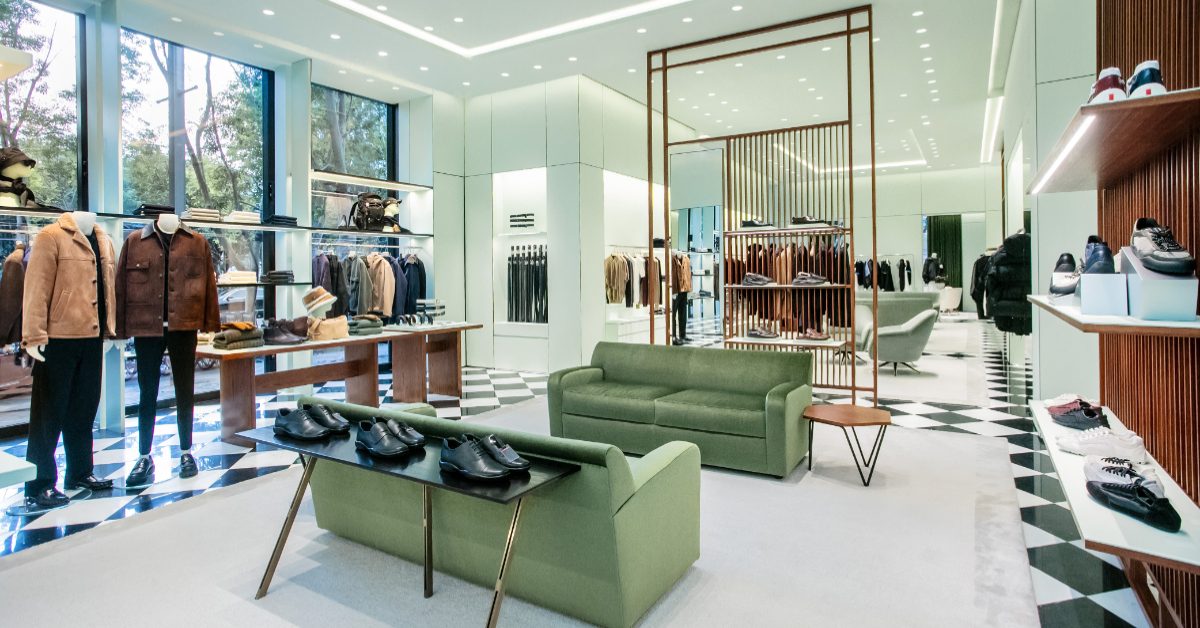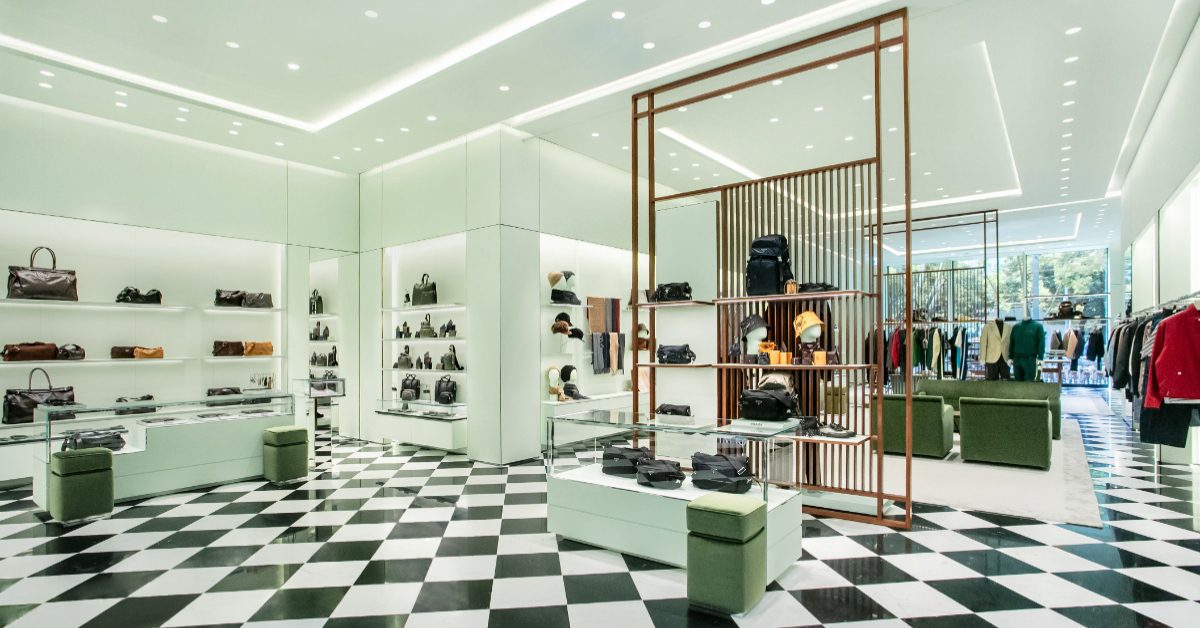店內空間則延續品牌標誌性的元素,採用靈感源自米蘭艾曼紐二世迴廊創始店的經典黑白大理石格紋地板。綠色布面牆面以黑色金屬線條框構出牆面陳列空間,木質屏風營造更私密的專屬區域。而檀木邊桌、天鵝絨座椅及米色地毯完整了整體設計,並為空間注入暖意與歡迎的氛圍。