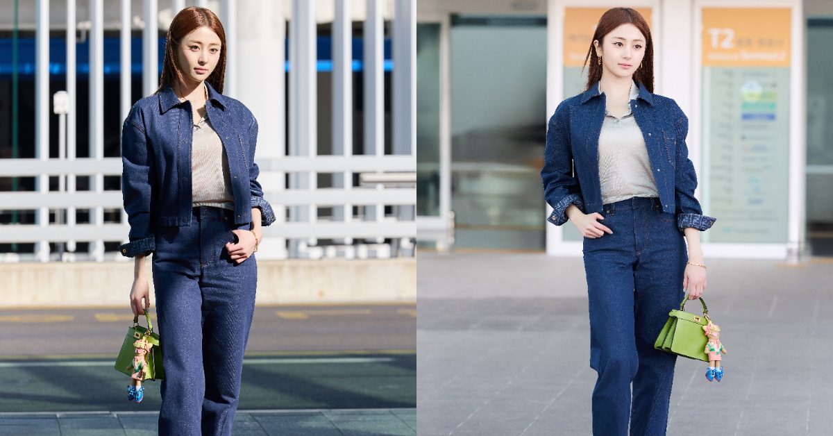 韓國女團LE SSERAFIM成員許允真今日同樣現身仁川國際機場,前往米蘭。她身穿FENDI灰色絲質Polo裇,外搭FENDI牛仔外套,配搭高腰牛仔褲及FENDI Arco鞋款,並襯以FENDI O’Lock耳環及手錶。她手上的森林綠FENDI Peekaboo ISeeU Petite小牛皮包款掛上FENDI BFF吊飾,為造型平添奢華氣息。
