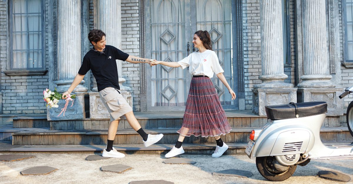 ● 首部曲:『愛心印花T恤』穿上專屬於兩人的T恤,迎接令人心動的一天,低調的愛心元素把心意藏在細節裡,想要低調放閃?男款可以搭配灰色工裝短褲,展現俐落感;女款則選以搭配充滿視覺張力的酒紅色細褶長裙 。透過紅、白、黑的色調呼應,不張揚卻很有重點 。