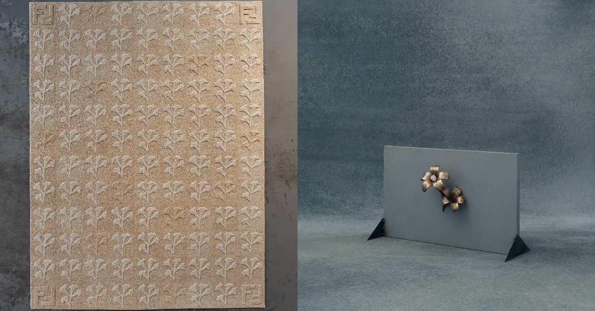 「Fonderia Fendi」於 Design Miami/ 2025 展會中化身為一處私密的「沙龍」,宛如一個沉浸於柔和光線中、淡雅簡泊的繭室,光線流瀉於 Vallese 那些以不朽自然材質所形塑、手工塑形且充滿有機生命力的巨型創作之上。系列以羅馬風格配色呈現:玫瑰色青銅、FENDI 經典的「sorbetto」黃與淡雅的「茴香」藍,並擁抱不完美美學,呈現畫意質感,包括不透明玻璃的柔和彩虹光澤、簇絨地毯的浮雕紋理及釉面瓷磚的層次光影。