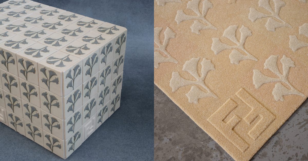 盛開綻放的百合花點綴其中,優雅的青銅長椅、休閒椅、隔間屏風及發光壁燈皆以 FENDI 招牌「Selleria」縫線壓印出浮雕圖案,模糊了工業工藝與手工創作的界線。呼應「咆哮的二十年代」新藝術、裝飾藝術與現代主義風格的交匯碰撞,作品以 FENDI 皮革工藝加持,平面鋪陳「cuoio Romano」皮革,並飾以品牌代表性的 Selleria 縫線。一系列模組化的長凳與立方體邊桌採訂製壓紋陶瓷磚製作,瓷磚上以手工雕塑出蘭花或百合花圖案,其間點綴著柔色釉面的雙 F 字母標誌瓷磚。Murano 手工吹製霧面玻璃花瓶呼應這個系列的主色調與花卉圖案,並且搭配 CC-Tapis 手工簇絨羊毛地毯,呼應 Vallese 幻想花卉的瓷磚效果,為她華麗精心裝飾的 FENDI 沙龍勾勒出 360 度全景視野。