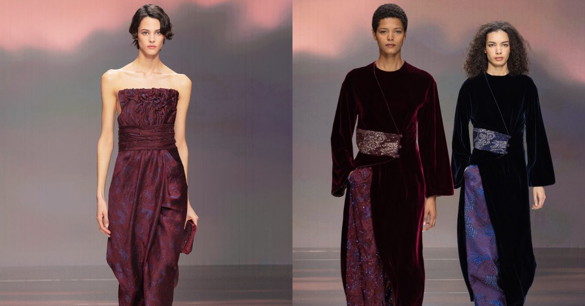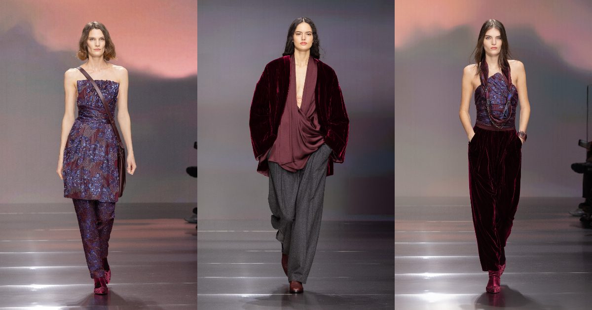 廓形柔和而輪廓分明,挺括亦鬆弛有度,達成自然可辨的平衡。系列採用法蘭絨、羊絨、 縐紗與絲絨等富有觸感的面料,和諧相融。夾克去除墊肩設計;大衣與短款上衣包裹身形,寬松剪裁兼具解構風格;男性氣質的垂墜長褲輕拂地面;針織衫下若隱若現露出襯衫邊角。色彩以灰色、鼠尾草綠、藍色鋪展,白色點亮其間,彰顯純粹質感。酒紅色作為色系主線,將設計敘事引入夜幕時分,此刻衣衫輕盈仿若無物,化作飄逸的面料:束腰外衣搭配長褲,以褶皺與刺繡勾勒出巍峨山巔,借由立體工藝與精緻細節演繹山巒景致。