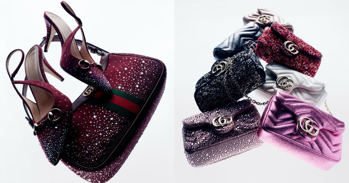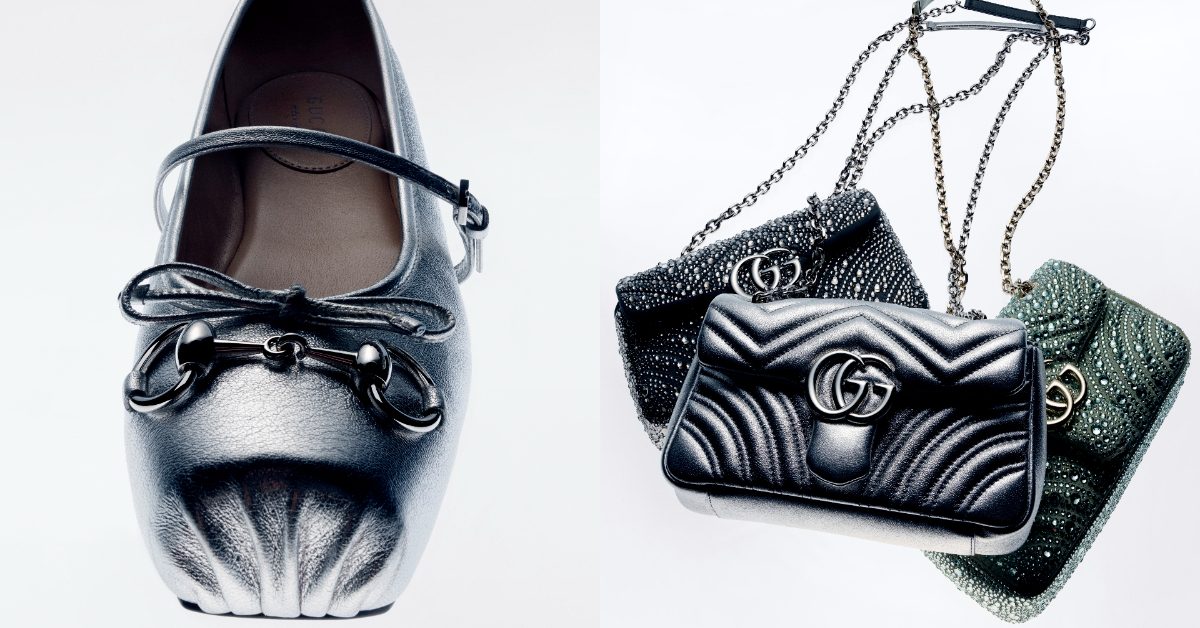 Gucci 在年終派對季節,以閃耀亮面金屬色為主題,展現節日奢華魅力。閃亮且帶有珠光以閃亮水鑽所呈現的反射光效果,點燃派對熱情,增添獨特層次感,讓穿戴者成為矚目焦點。
