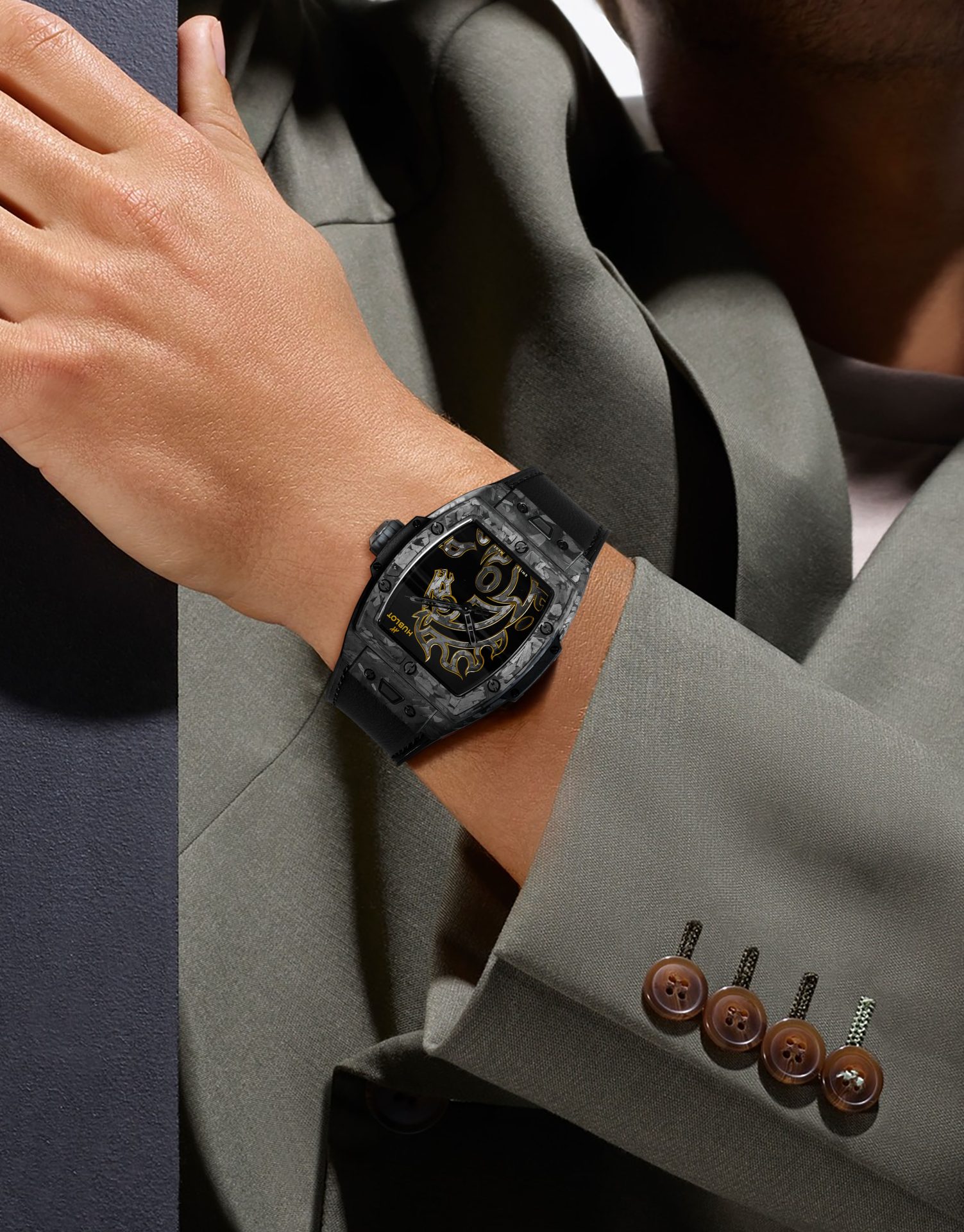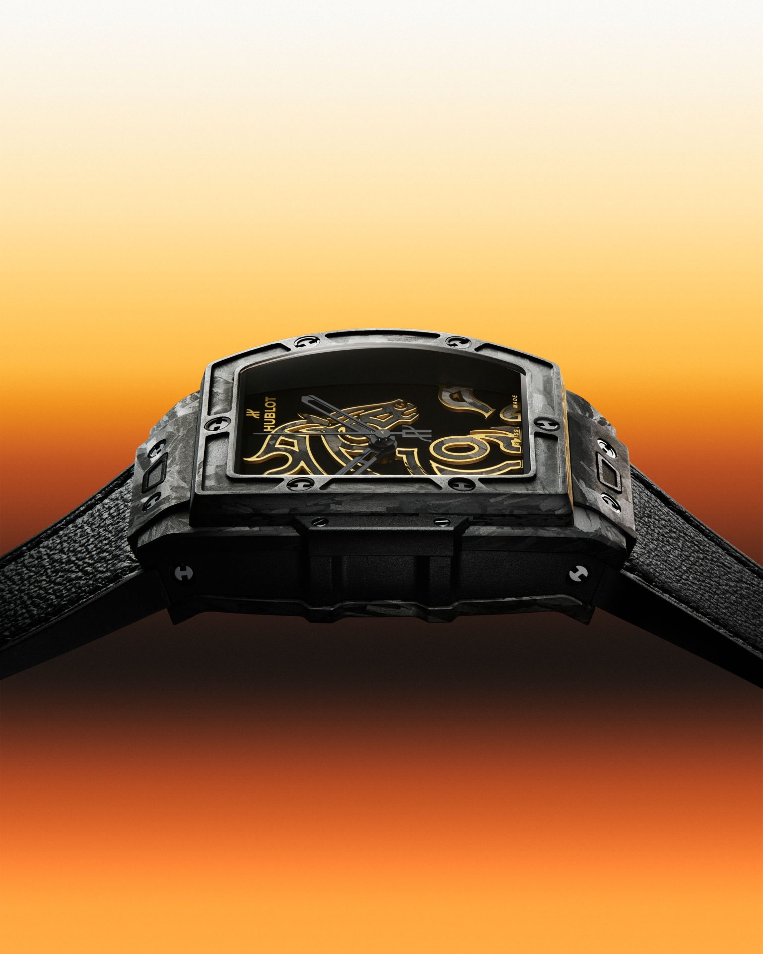 Spirit of Big Bang 系列在宇舶作品中扮演實驗與日常之間的關鍵角色,酒桶型結構帶來清楚的造型辨識度,同時保留佩戴時的平衡感。霧面黑色碳纖維錶殼、黑色漆面基底與煙燻藍寶石錶背,共同建立層次分明的暗色調系統,材質在這個系統中成為主體語言。