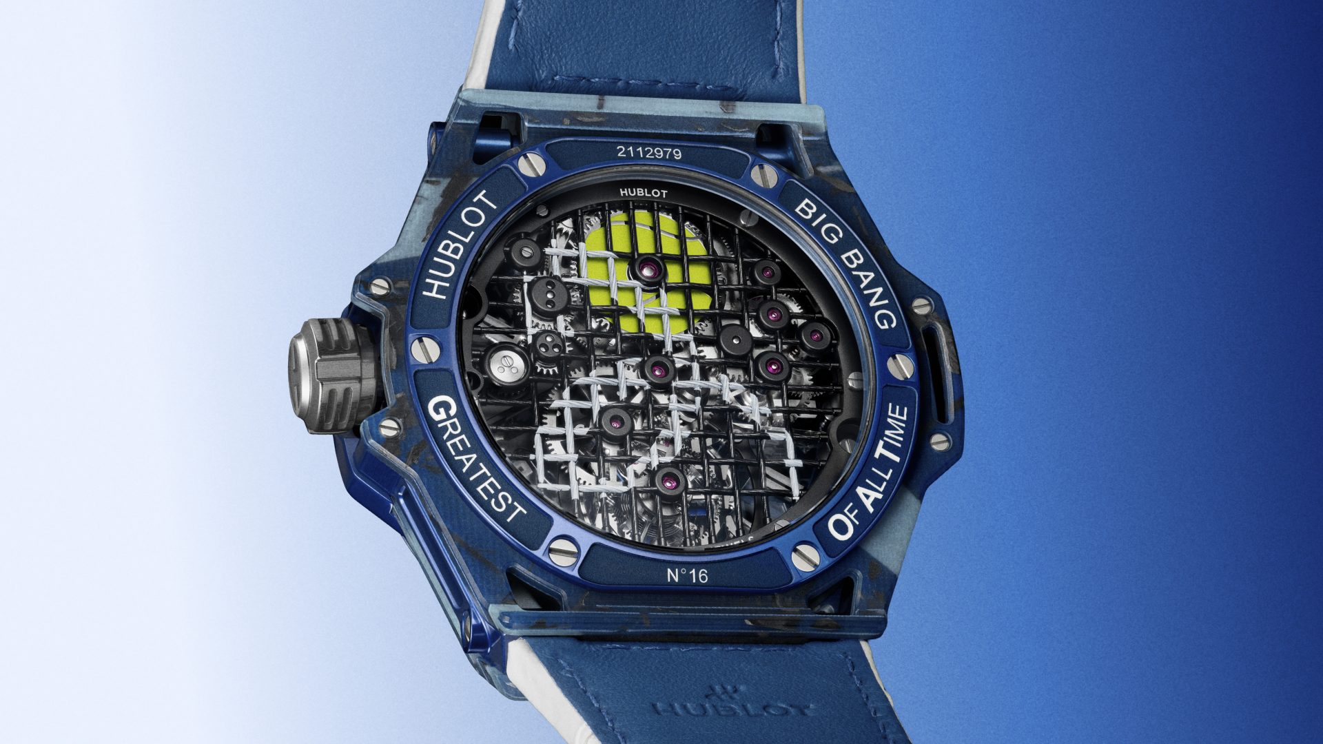 腕錶搭載MHUB6035自動陀飛輪機芯,將網球拍線結構轉化為夾板設計。雷射雕刻呈現線距變化,呼應比賽中的張力節奏,72小時動力儲存發條盒設計為微型網球,使能量累積與釋放集中於核心。