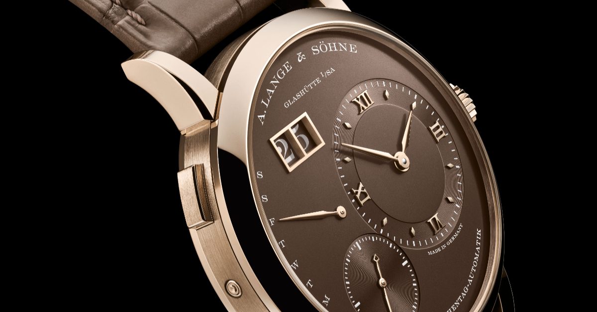 LANGE 1 DAYMATIC HONEYGOLD 搭配褐灰色手工縫製鱷魚皮錶帶,並搭配實心蜂蜜金錶扣。