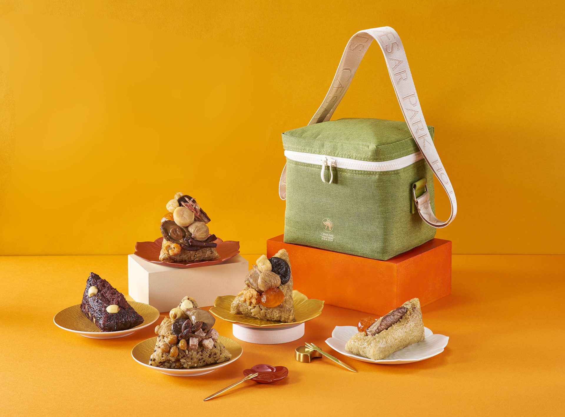 凱撒皇家粽香禮盒(鮑貝、花雕雞、鮮肉、紫金相思、紅藜蔬福)NT$1,280;早鳥價NT$1,088