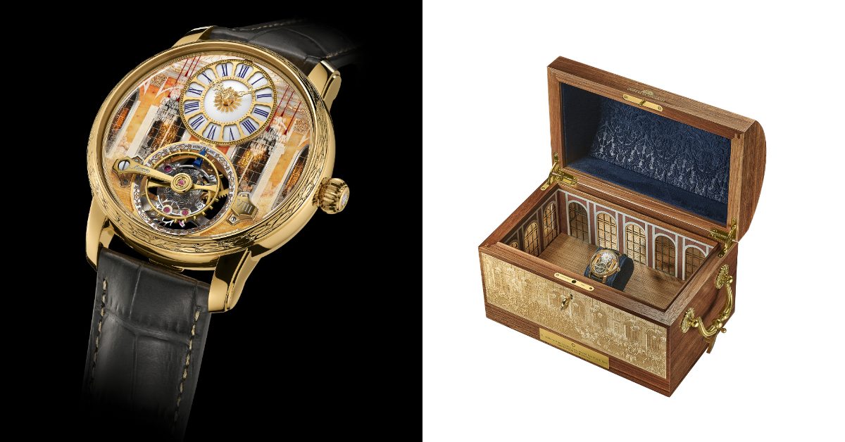 MONTBLANC明星傳承系列懸浮式外置陀飛輪凡爾賽宮腕錶搭配音樂錶盒,錶盒由1976年創立的巴黎奢華木藝品牌Elie Bleu打造。錶盒內部的音樂機芯則自瑞士Reuge 製作,該品牌自1865年以來,便專門製作奢華音樂盒與機械鳴鳥。盒中播放的樂曲,正是在1745年2月的傳奇晚上,為慶祝王儲路易與其新娘成婚而特別呈獻的樂曲,由法國音樂家拉莫(Jean-Philippe Rameau)作曲,歌詞則出自伏爾泰之手。