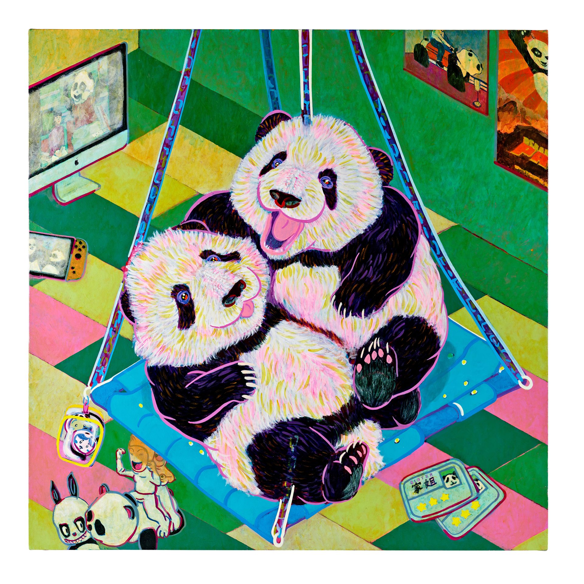 「自 1999 年開始,香港先後合共飼養了四對大熊貓,但畫中的兩隻是最特別的:2024 年出生的牠們,是第一對在香港出生的大熊貓,有就連香港入境處都以官方名義頒發『出生紀念狀』給這對姊弟;而且有別於過往『大熊貓陪伴香港人成長』,在社交媒體的傳播下,香港人紛紛化身『契爸』、『契媽』,見證第一對大熊貓龍鳳胎長大。比如畫中鞦韆光榮退休的一刻,都有上萬人一同見證。而大熊貓的可愛造型,一向是流行文化的常客。就如是次《@N1MALX:非人生活》展覽跨界別作品並置的展示方式,畫中亦將我們熟悉的流行文化作品,借來為家姐細佬的房間裝飾一番。」 —謝炎安