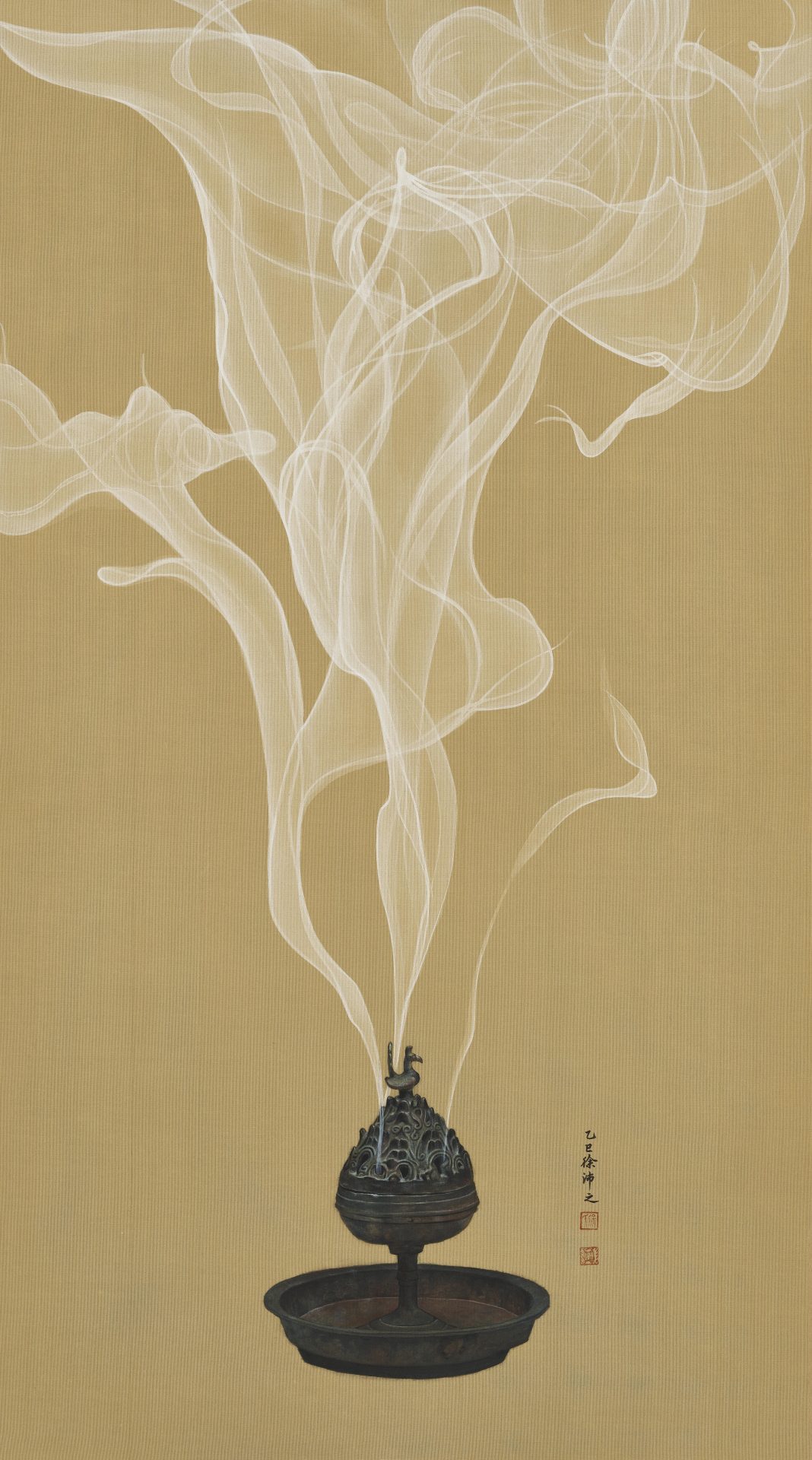「傳說博山爐如海上仙山,山上雲氣可以通天,即寓意通天達地。今次展覽繪製了兩個同為漢代的博山爐。其一為鎏金銀竹節銅薰爐,造工精巧,九條蟠龍活靈活現。薰爐的底座上亦透雕兩條蟠龍昂首咬住竹柄,三條蟠龍於竹節頂端將熏爐托起,另外四條金龍圍繞爐身飛騰,線條流暢,造型奇妙。另一為朱雀博山香爐,蓋乃鏤空的起伏山巒,有雲氣紋填充其間。蓋頂立一朱雀,底有承盤。博山爐配以輕煙的動態,聚散、靈動、朦朧,彷彿傳來一陣陣清心寧神的香氣。」—徐沛之