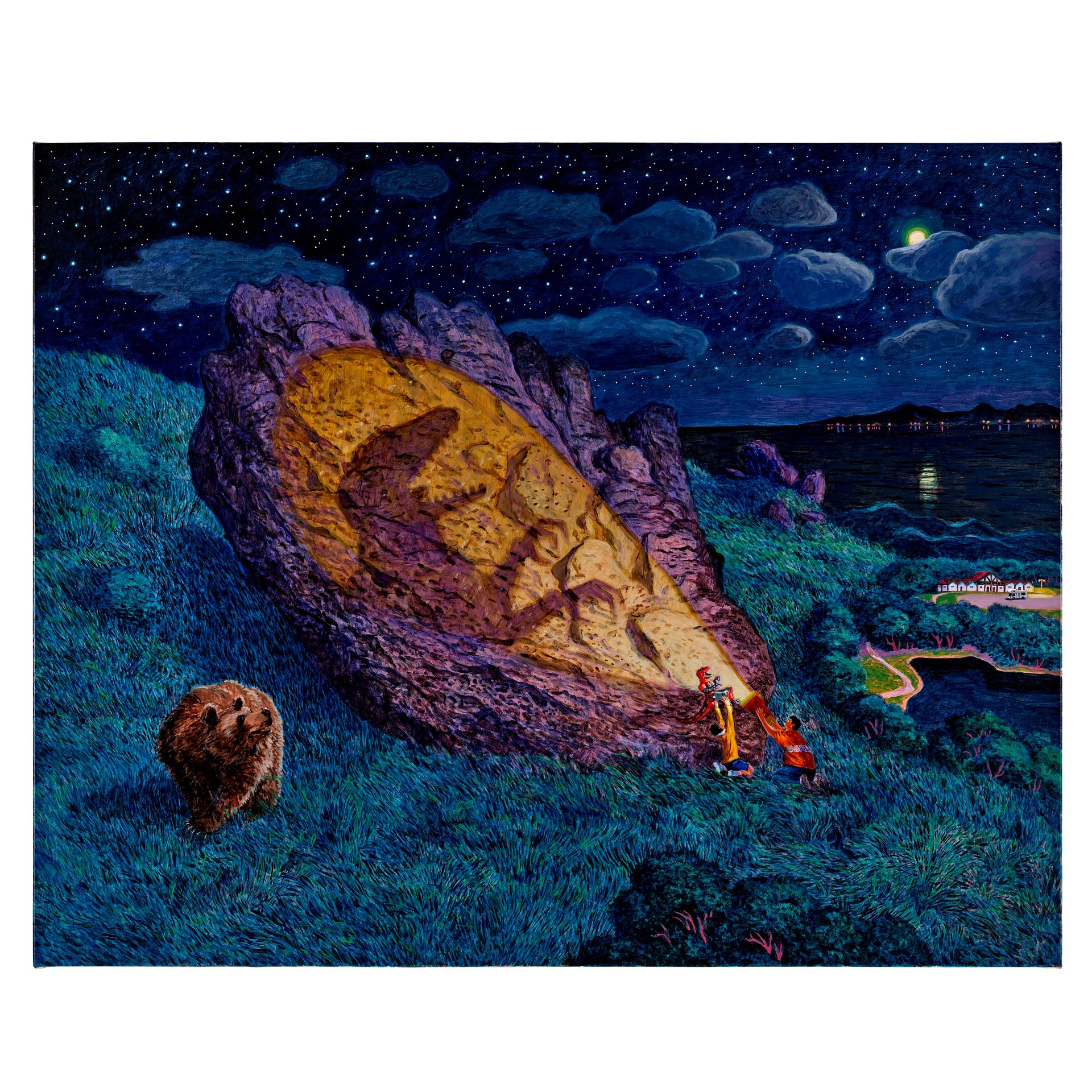 「我這代人成長於相對繁盛的香港,小時候放學回家最愛看日本的特攝片和卡通片。這些作品都有一個共通點,就是英雄人物的力量來源都是來自動物,無論透過合體或者變身,最後的形態都是人形配合動物的能力和特色造型。到今日有時候反思這個題材,依然覺得很有趣,一方面突顯人的渺小,同時又表達出人的自大。成長後知道這些角色和故事都是虛構,恐龍戰隊的機械人只是皮套。但我很想在今次的畫作中表達到小朋友對於他們心中英雄或者守護獸的信賴。在畫面中面對着棕熊的威脅,兩位小朋友把恐龍戰隊中的霸王龍玩具用射燈放大其投影在巨石上,令棕熊退卻。作為成年人可能會覺得小朋友的才智令他們脫困,但對於小朋友來說也許是霸王龍保護了他們。」—黃進曦