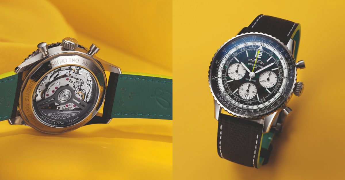 每一項設計細節,皆以性能為核心語言展開:Aston Martin賽車綠與清檸色調,取材自Aston Martin Aramco賽車塗裝;輕量化鈦金屬錶殼首次應用於Navitimer系列;碳纖維錶盤則直接呼應F1®賽車駕駛艙的關鍵材質。皮革錶帶的設計靈感源自賽車安全帶,而強化夜視顯示,則確保在任何競速環境下,皆能清晰判讀時間。
