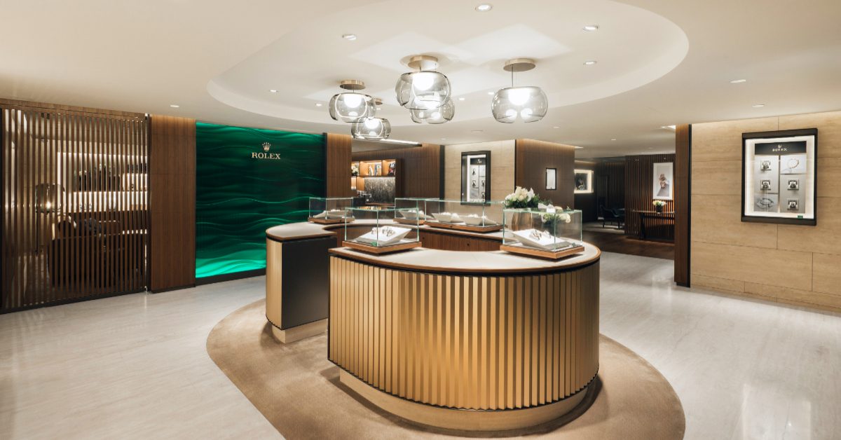 店面設計處處彰顯著勞力士的腕錶美學。店鋪外牆的洞石設計,其圖案靈感源自經典蠔式腕錶的三角坑紋外圈。步入店內,來賓就被接待區的櫃枱和兩邊的展示櫃吸引,令人目不暇給,讚歎不已。懸掛於接待櫃枱上方的高雅吊燈,與小窗凸透鏡的獨特圓拱形遙相呼應。貴賓區的獨特粉飾灰泥牆壁則以皮革包覆裝飾,向 Oyster Perpetual Day-Date(蠔式恒動星期日曆型)的3255型機芯致敬。