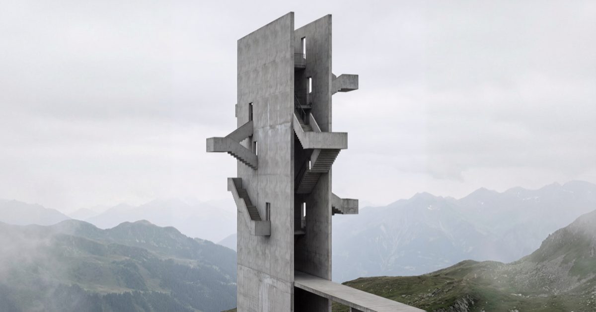 空間片段彼此交疊,混凝土平面延伸成天空,走廊被拉長至不可能的透視,室內與室外在同一畫面中崩解重組。這不再只是背景的轉換,而是結構的重寫。