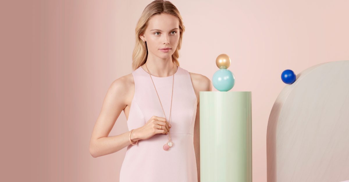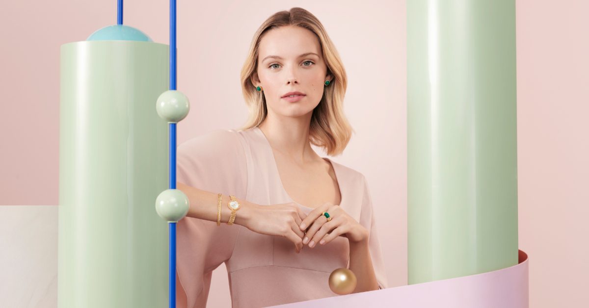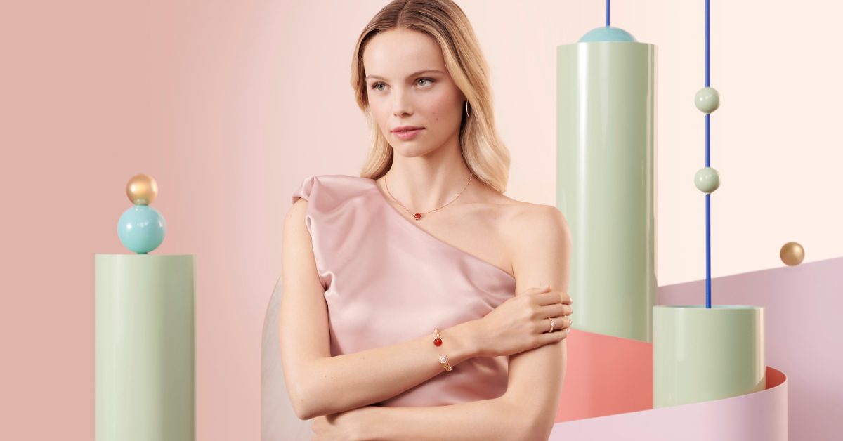 Arthur Hoffner說道,「Perlée 系列展現了律動、趣味與輕盈。自我們合作以來,我始終希望藉由如遊樂場般的場景,勾勒出金珠在懸浮軌跡中的靈動姿態。這也是為什麼許多元素看似漂浮、近乎不穩定,卻能藉由精巧的安排與富有節奏的布局展現獨特魅力,並以鮮明色彩營造出虛實交錯的互動感。」