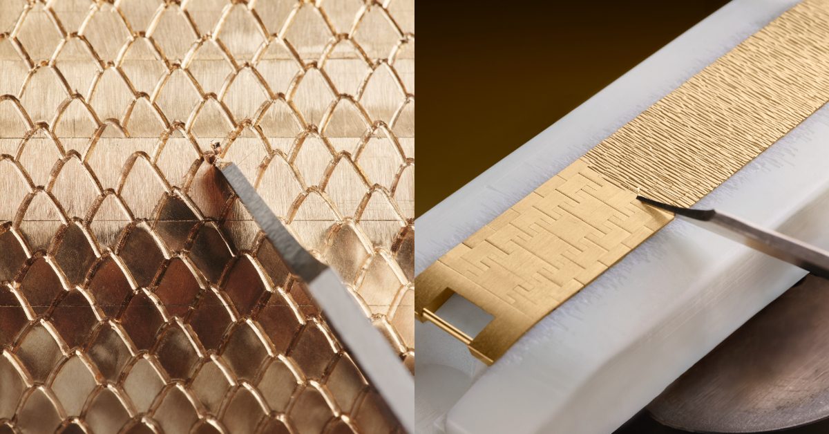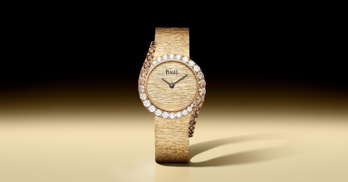 嘗試大膽張揚的同時,另一款新作則回歸Limelight Gala系列一貫的內斂奢華。18K玫瑰金錶殼與錶鍊全以經典樹皮紋理點綴裝飾,細膩的手工溫度於光影間變化,由淺至深排列的干邑色美鑽,交織出溫潤深邃的層次感。「Décor Palace 宮廷式雕刻飾紋」誕生於1961年,以手工逐道刻入金質表面,每件作品皆因世家工匠手勢與節奏不同而呈現獨一無二的生命力,成為PIAGET聞名全球的代表金工技藝之一。