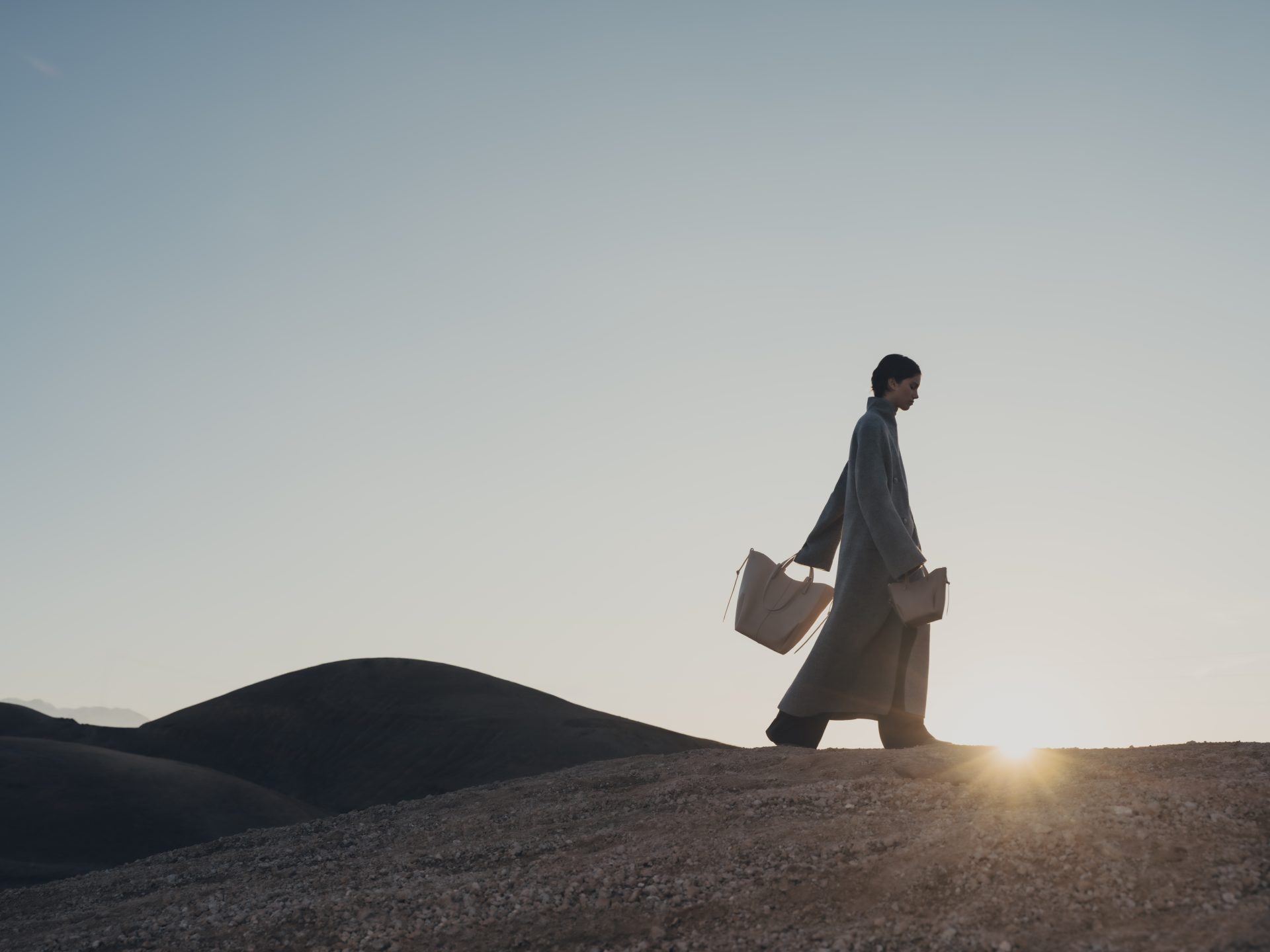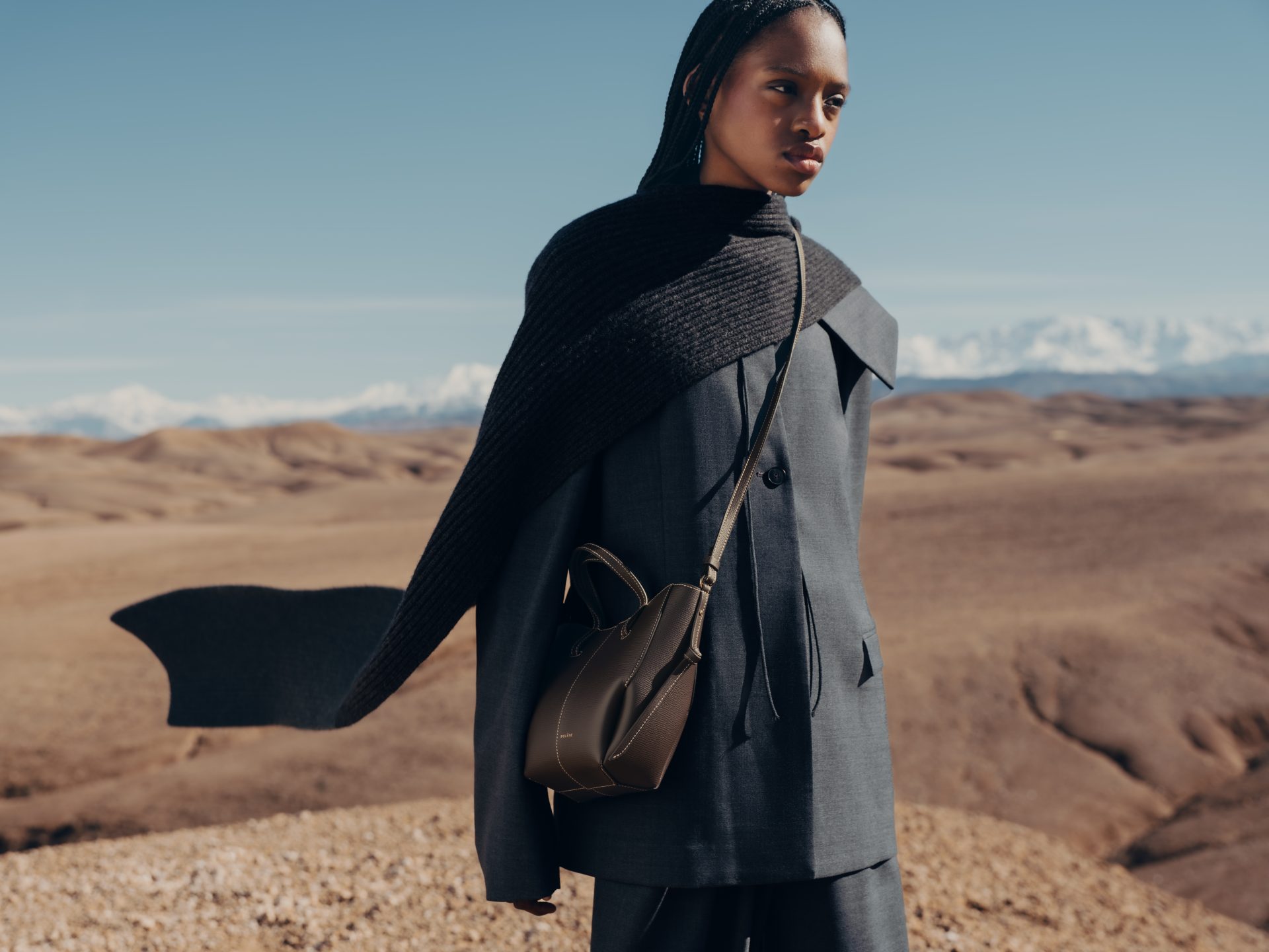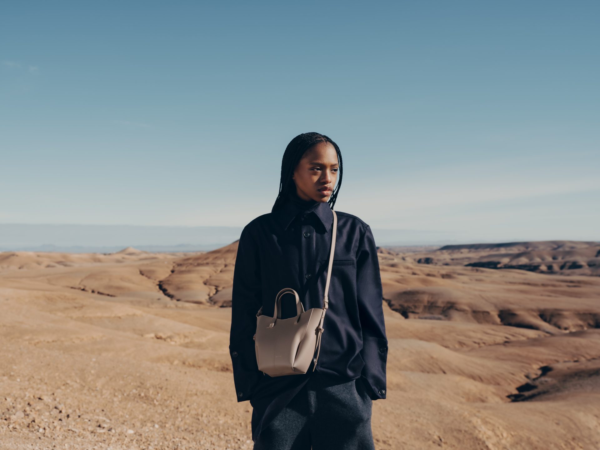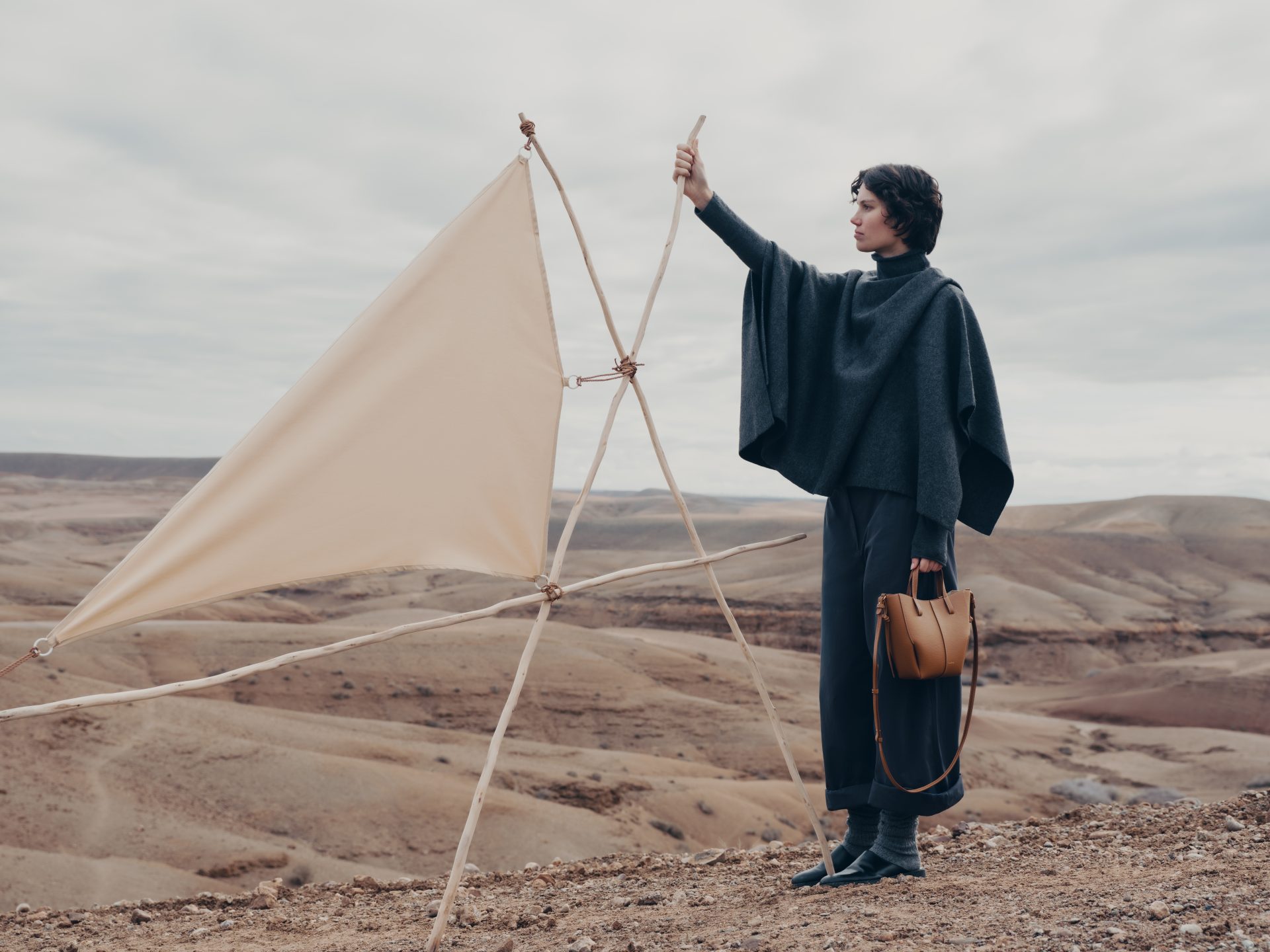 品牌最新一季形象將場景帶到摩洛哥阿加菲沙漠,畫面幾乎只剩沙丘、天空與遠方山脈,模特兒站在風中,巨大的布幔隨氣流展開。整體影像呈現出一種開闊而沉靜的氣氛,使包袋輪廓在廣闊背景中變得更加清楚。這組影像由法國攝影師Charlotte Lapalus掌鏡,她擅長捕捉人物與動作之間的細微關係,畫面因此既帶有流動感,也保留一種穩定節奏。