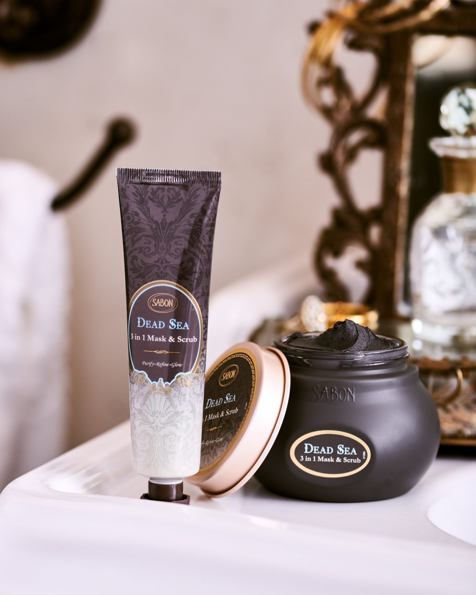 在三部曲之外,SABON亦延伸出更深層的療癒品項:「死海黑礦泥身體泥膜」以臉部保養的精準概念呵護身體,細緻的泥質完整吸附多餘油脂與髒汙,灌注養份,讓肌膚在短短五分鐘內重現澄淨光采;而「死海黑礦泥浴鹽」則讓療癒延伸至心靈,只需將一勺浴鹽融於熱水,伴隨岩薔薇的木質香氣瀰漫,使肌膚與感官一同浸浴於放鬆與純淨的氛圍中。