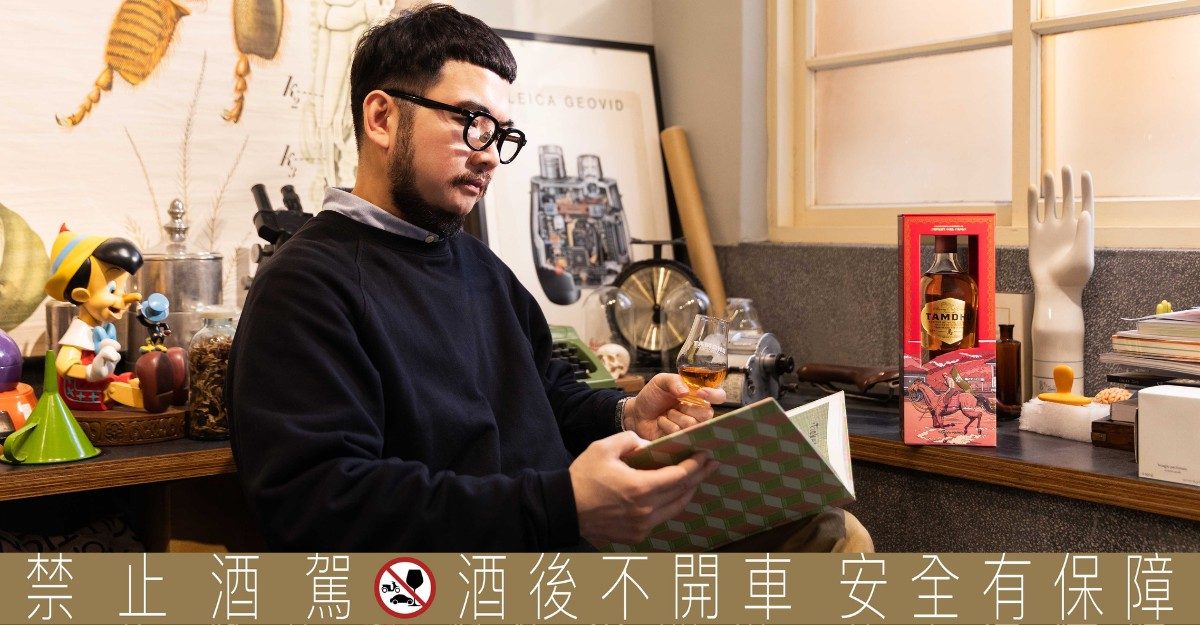 鄒駿昇的色彩選擇也值得玩味。他刻意收斂鮮豔色調,轉而採用帶有歲月感的老色調,這種色彩本身就隱含了時間的厚度;畫面中那條偏粉紅色的河流,正是斯佩河的意象。坦杜自1897年成立以來,一直使用流入斯佩河的水源進行蒸餾,這條河儼然是其威士忌風味的根本之一。藝術家將這些元素巧妙融合,讓一個威士忌包裝成為關於旅程、風味與時間的完整敘事。
