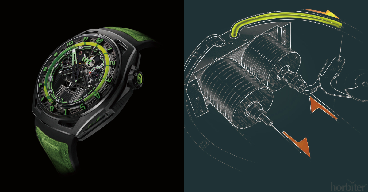在傳統觀念裡,液體和機械錶是水火不相容的,機芯零件一旦碰到水就無法正常運作,HYT 卻偏偏反其道而行,透過液體來顯示時間。錶殼內還是有傳統機芯,只是機芯額外與兩個波紋壓縮器相連,機芯運轉連動壓縮器張縮,進而推動位於毛細管內的液體。至於毛細管內則有兩種流體,透明的與有顏色的流體經過特別研發,就像醋與油一般彼此不會互相混合,被壓縮器推動後便可在毛細管中此去彼來地標示出時間。