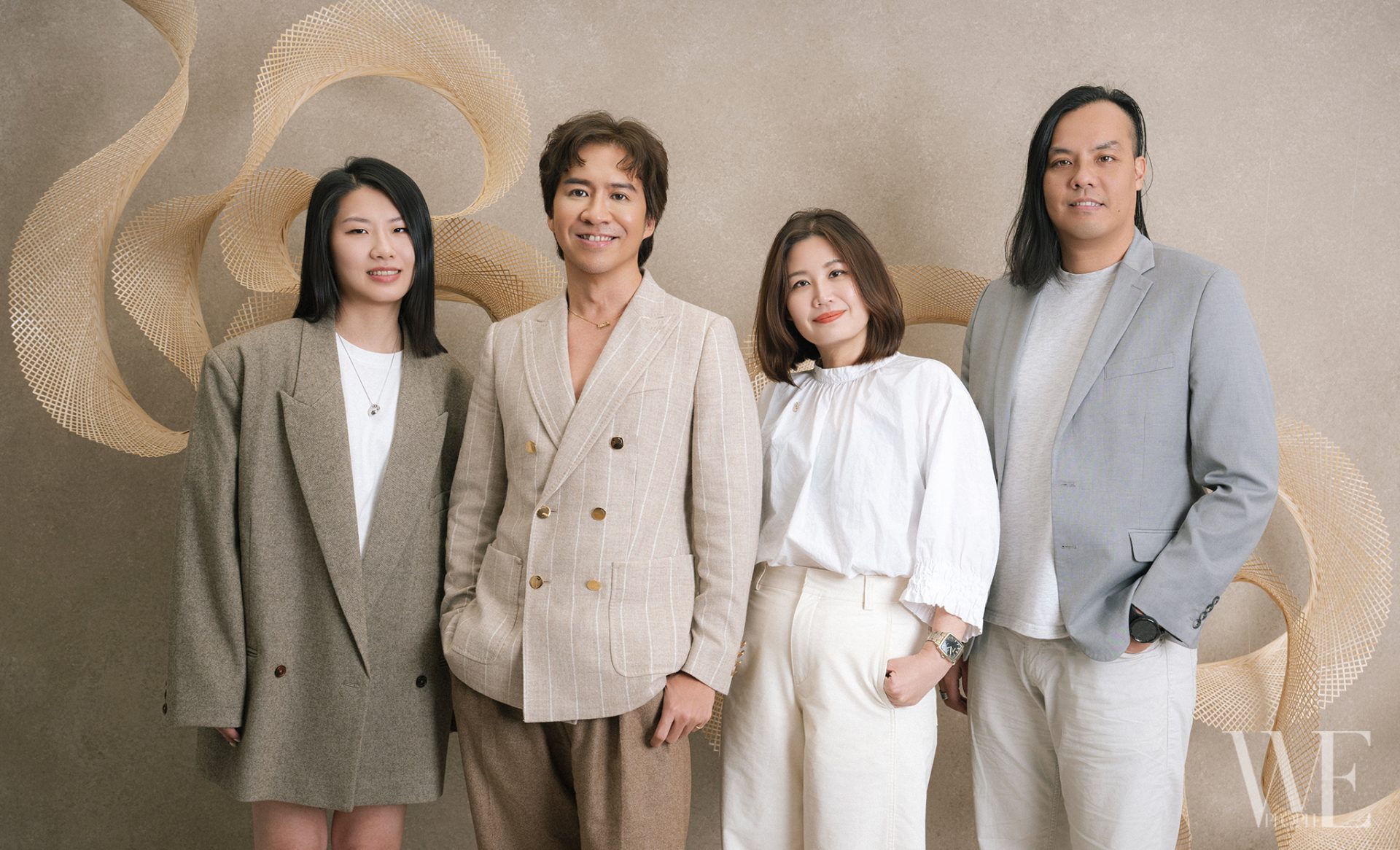 這件優雅的裝置藝術,是藝術家林靖格的作品「流光之環」,以一條連續竹篾為生命線,採螺旋編織工法,創作出一條曼妙緞帶;每一圈纏繞皆經過精準對位,縷縷編隙讓光影流瀉,彷彿能觸及那細密交錯的肌理。徐布說,緞帶之於他而言有著雙重意義。既是為禮物加分的裝飾,讓平凡的盒子瞬間有了儀式感與質感;更是一種提醒,提醒著每一位彼威的成員,他們的角色永遠是襯托,是讓主角的光芒更加璀璨的那個存在。